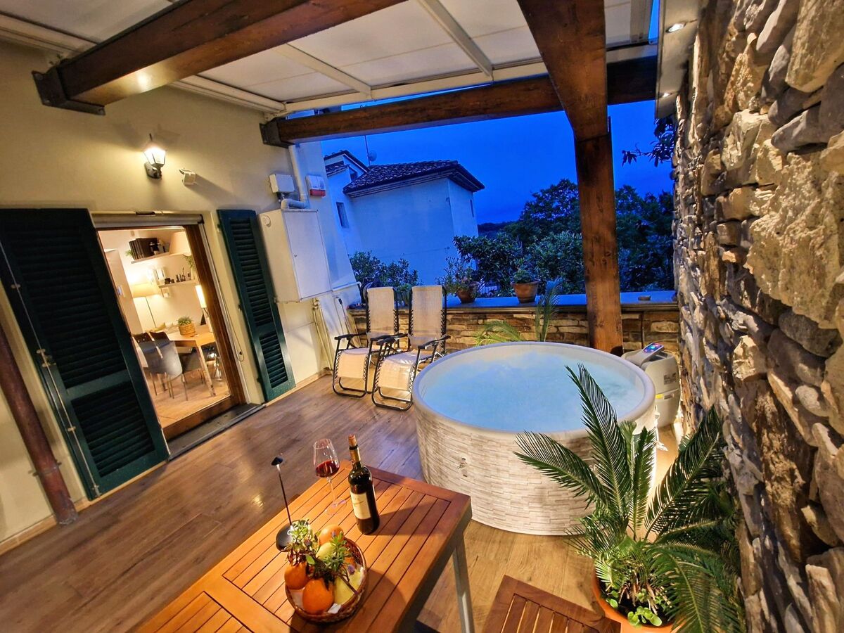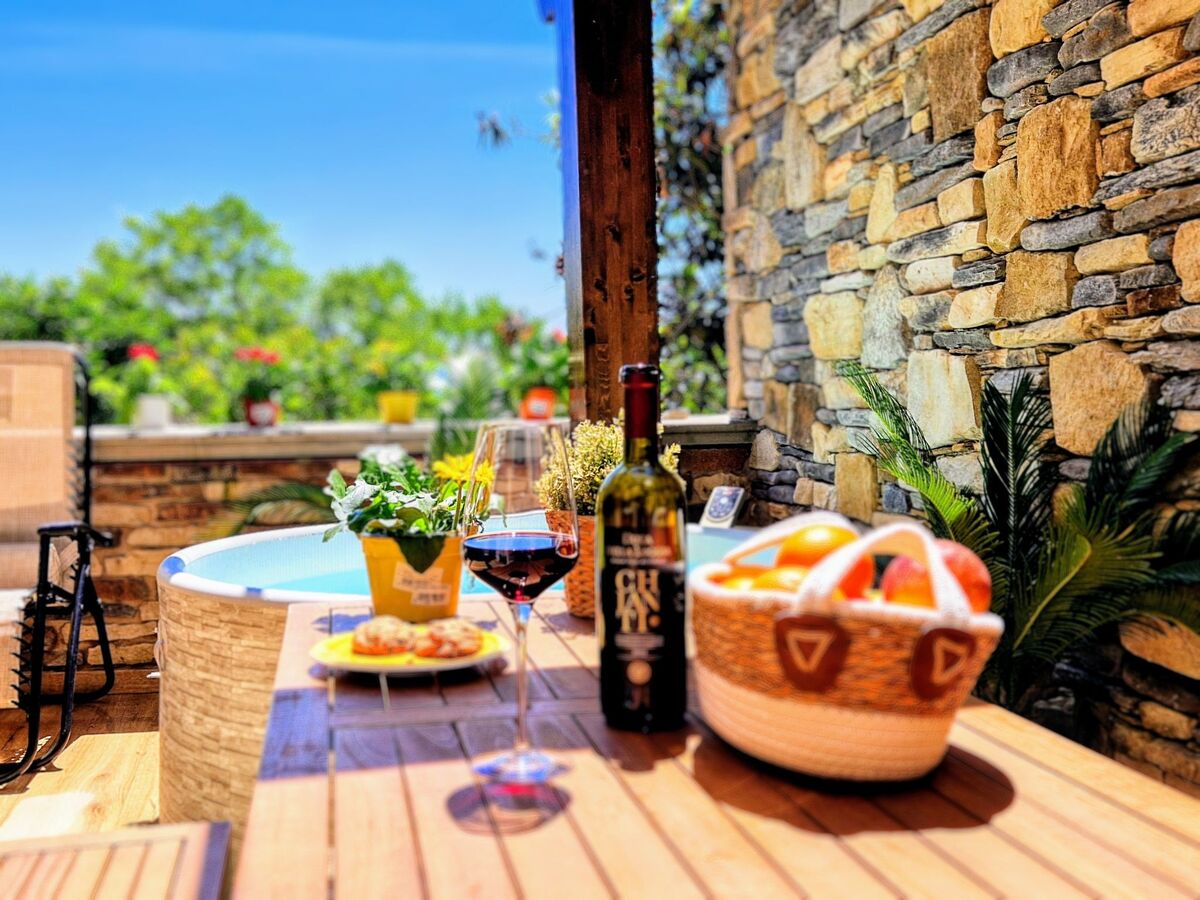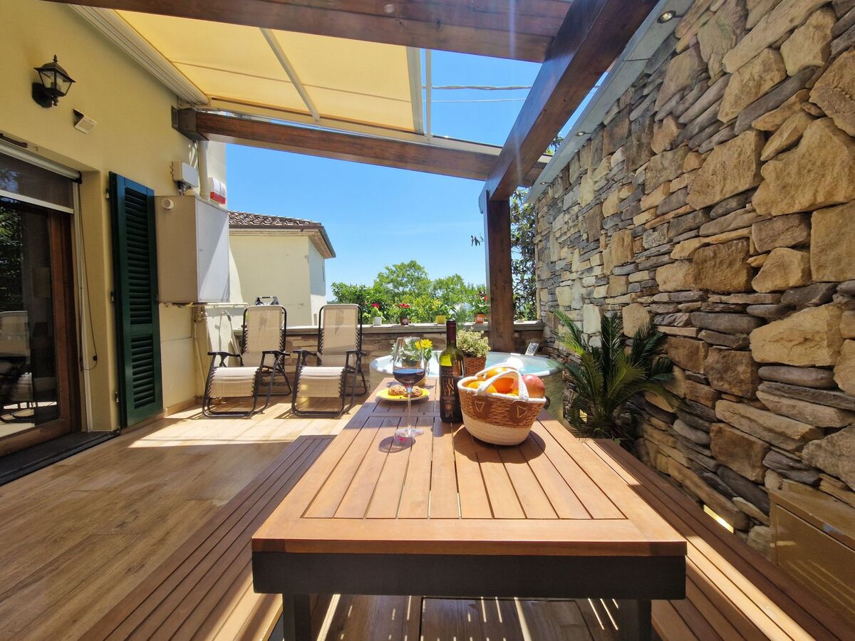 Le site'esterno, una suggestiva terrazza con vista panoramica aumenta il valore di questa dimora, dotata di vasca idromassaggio e lettini prendisole ideali per momenti di puro relax ammirando lo splendido scenario naturale che circonda la casa.