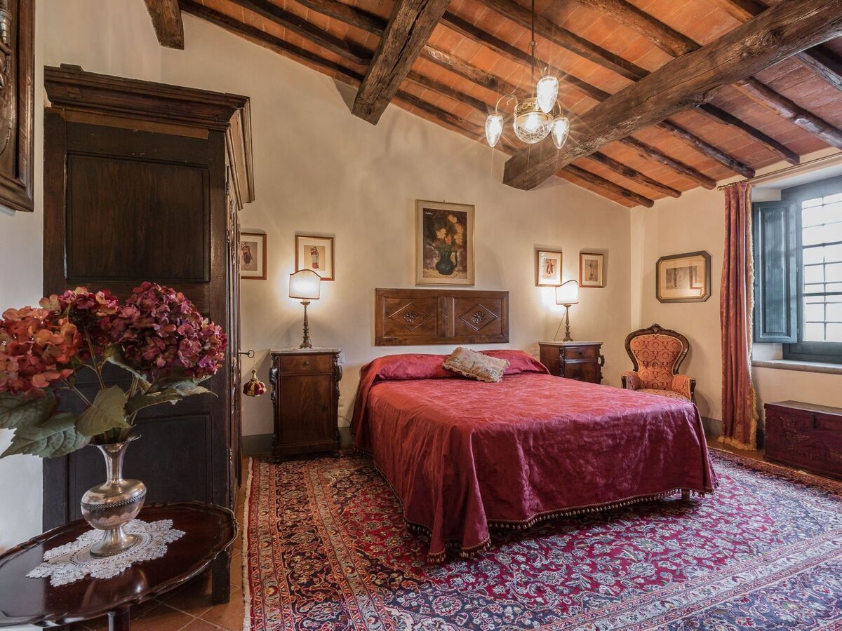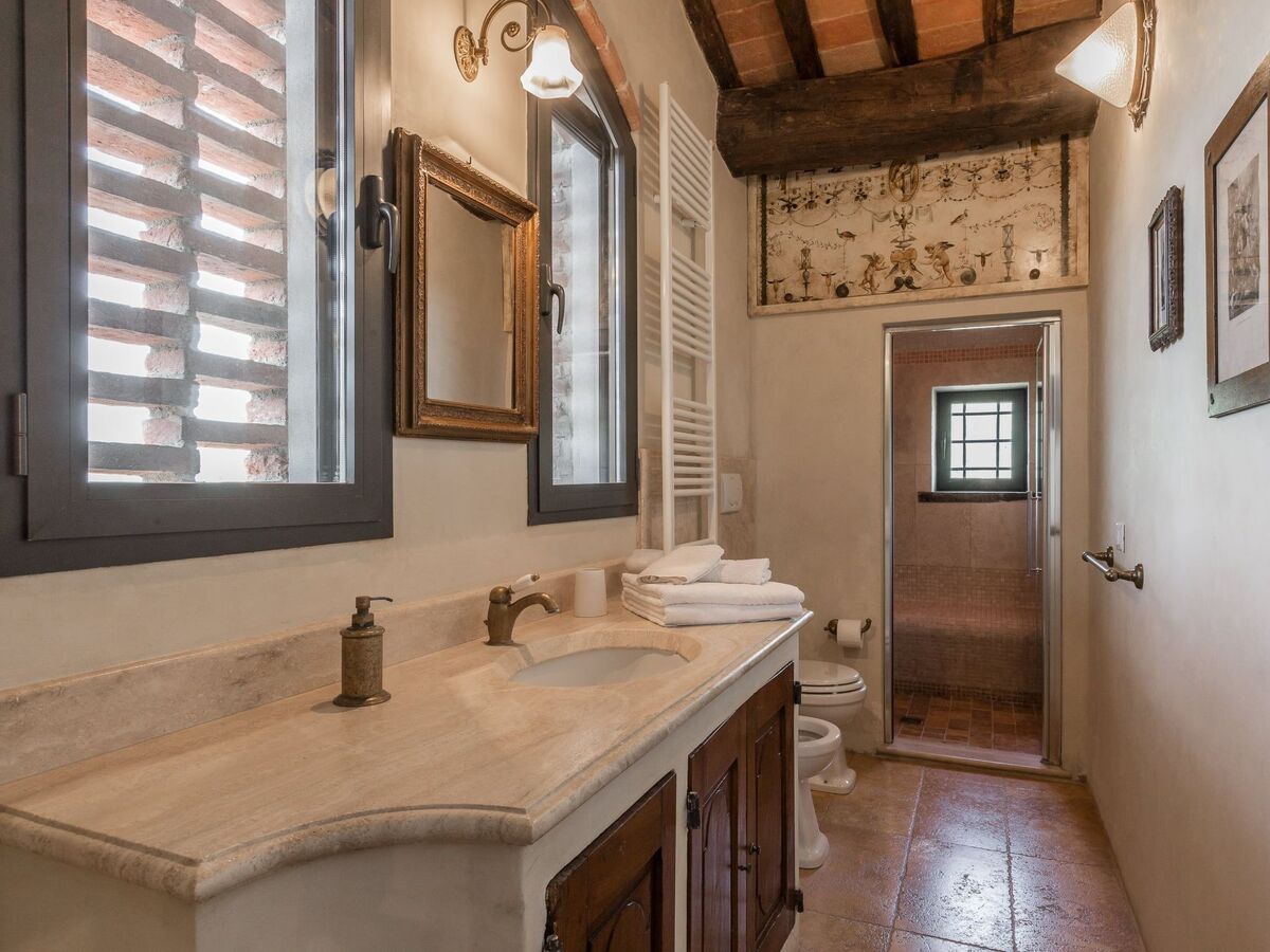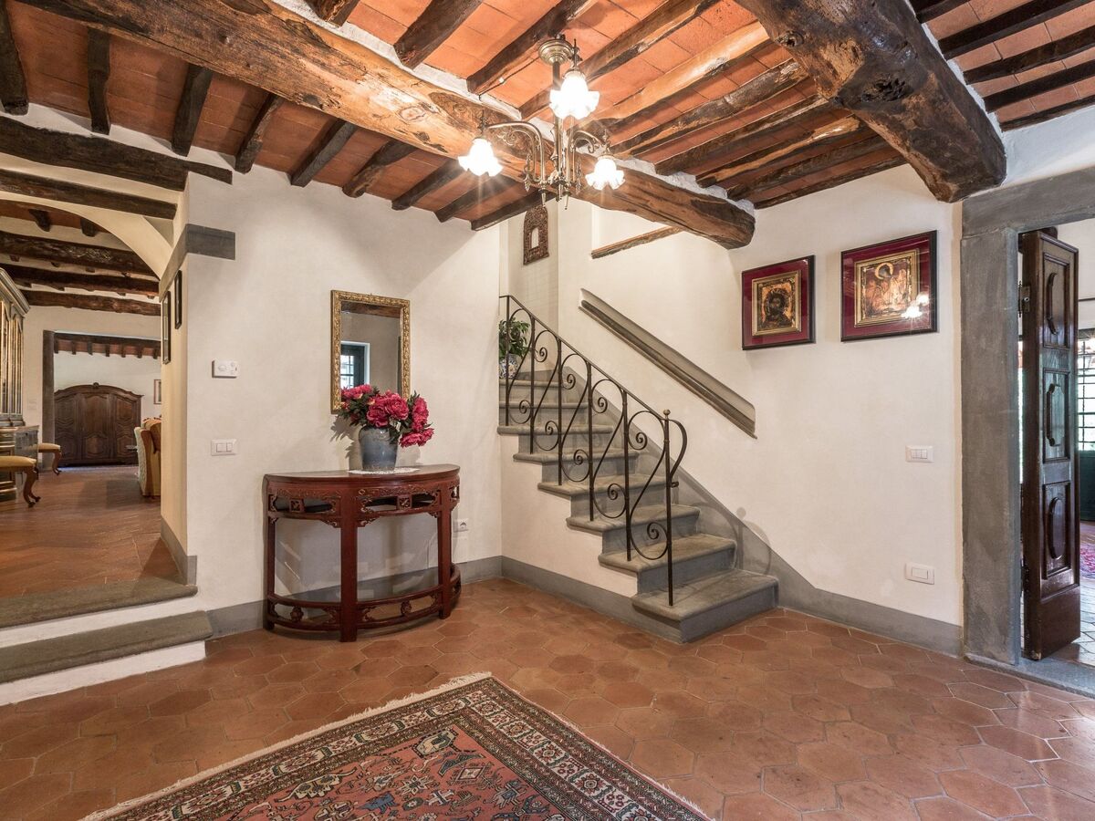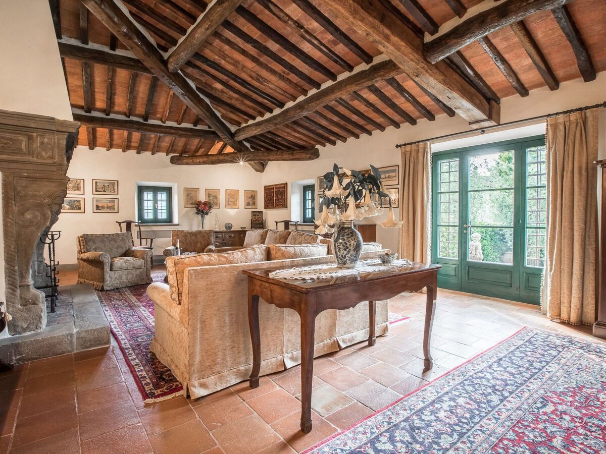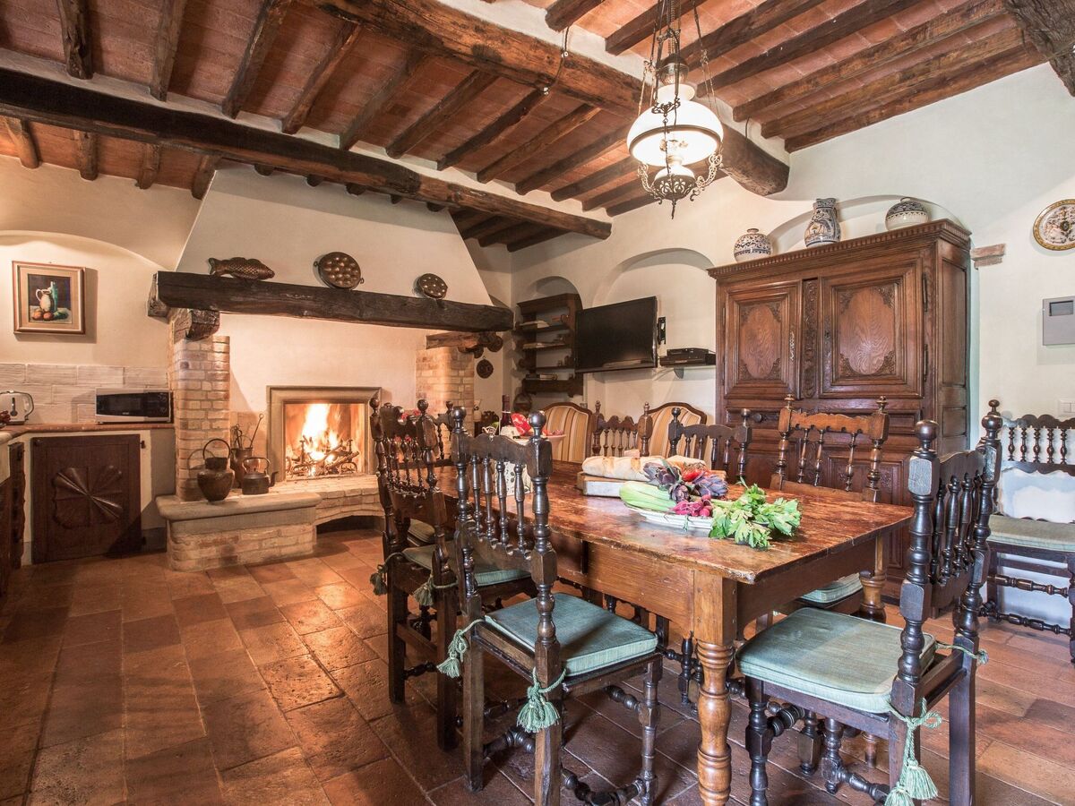 On the ground floor there is a large living-dining room (80 square metres) with a table for 14 and a magnificent 16th century fireplace (not in use), sloping ceilings with wooden beams and French windows overlooking the garden with views of the historic centre of Monsummano Alto; A further living room with satellite TV (Netflix, Bose Bluetooth acoustic speakers) and a double sofa bed and a single bed leads to the large Tuscan kitchen with fireplace (fully equipped with professional hob with 2 ovens, side-by-side refrigerator with icemaker, dishwasher, microwave, Nespresso coffee machine, American coffee machine, moka coffee maker, toaster, blender, juicer), a cast-iron stove with ovens and a French window leading to the veranda suitable for outdoor dining with a table seating 14 a double bedroom with a 17th-century fireplace (not in use) and French doors leading to a covered veranda; a bathroom with a hydro-massage shower; and a laundry room with a washing machine and dryer.