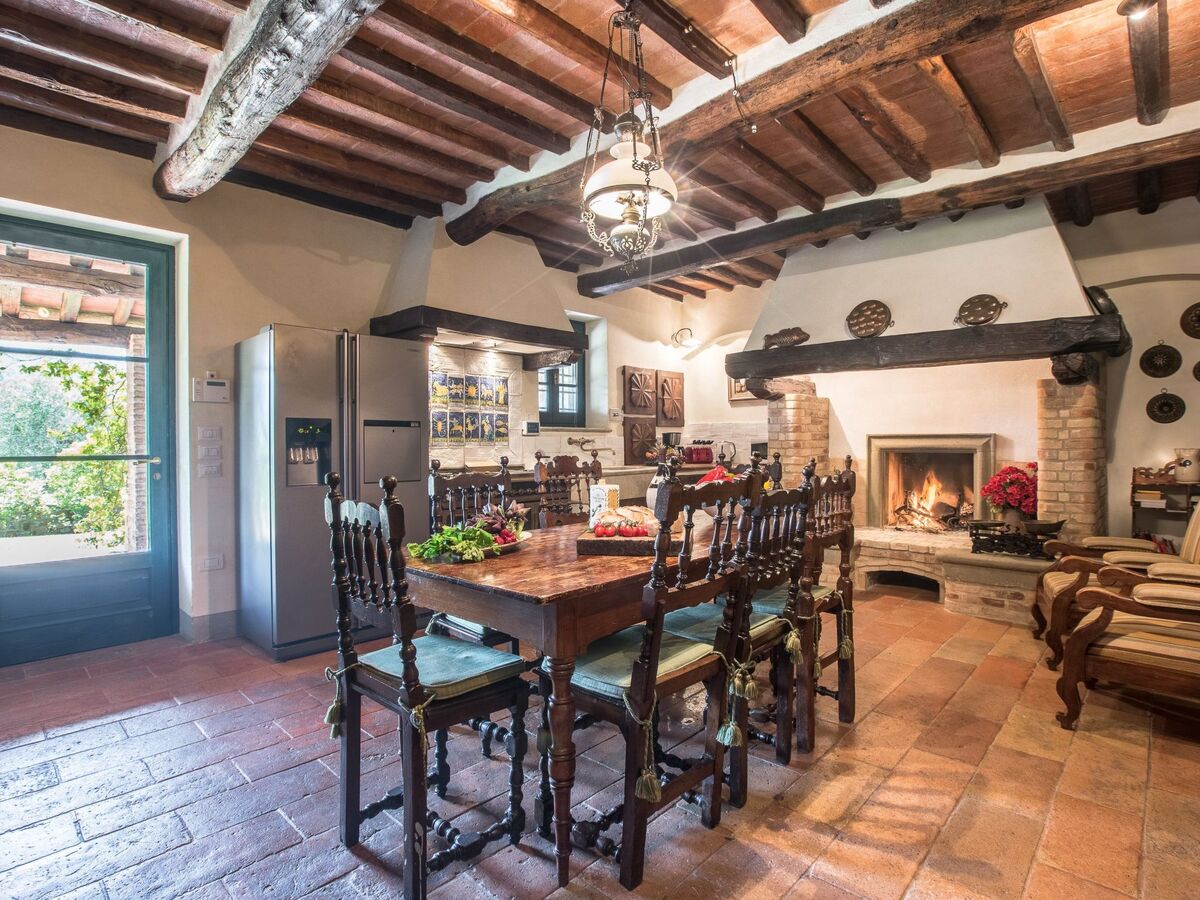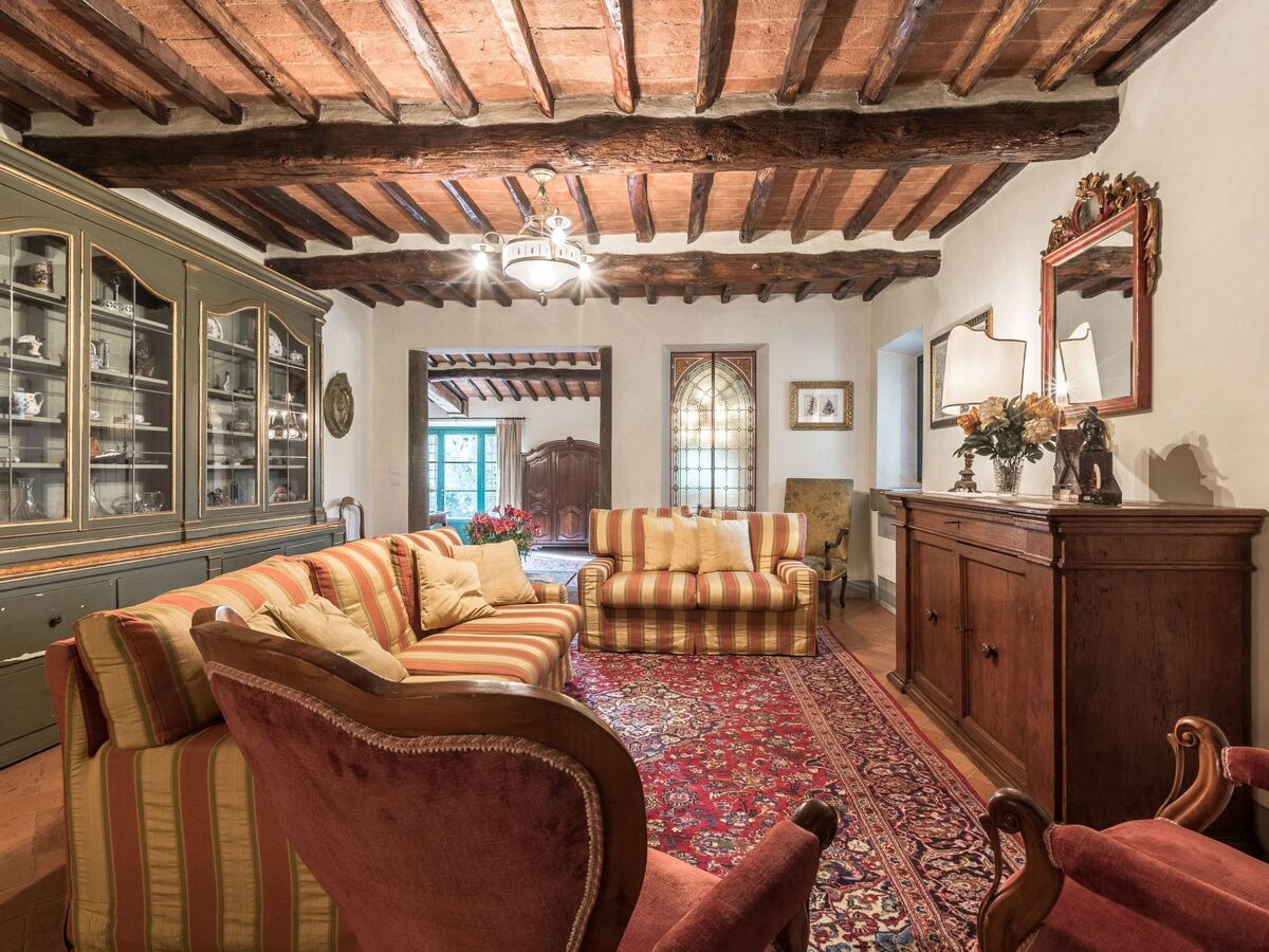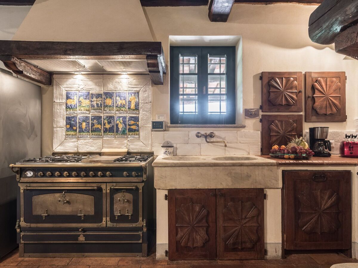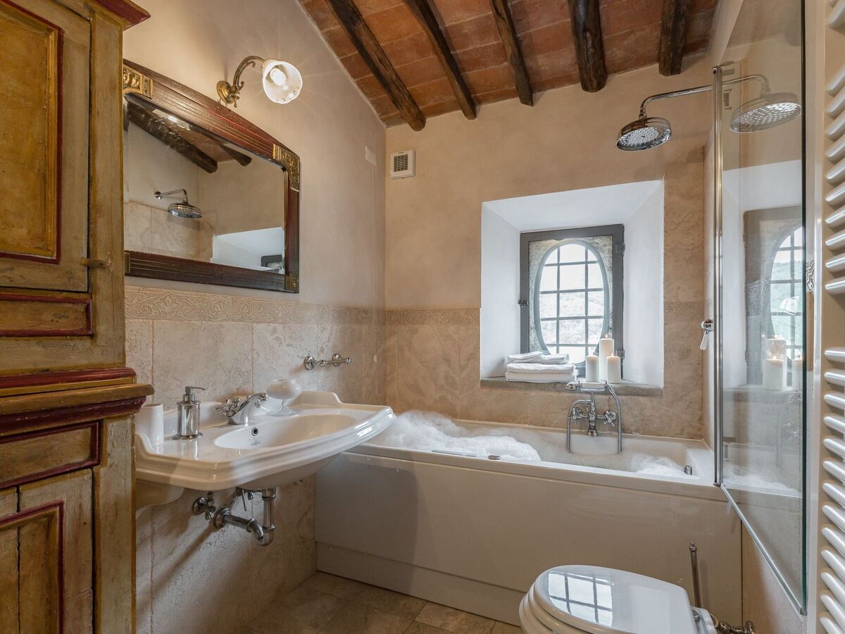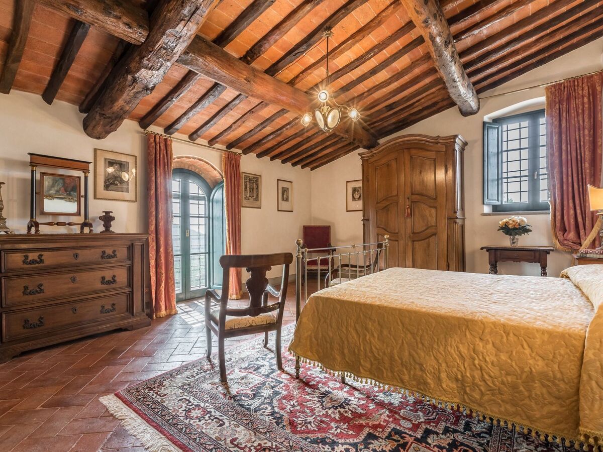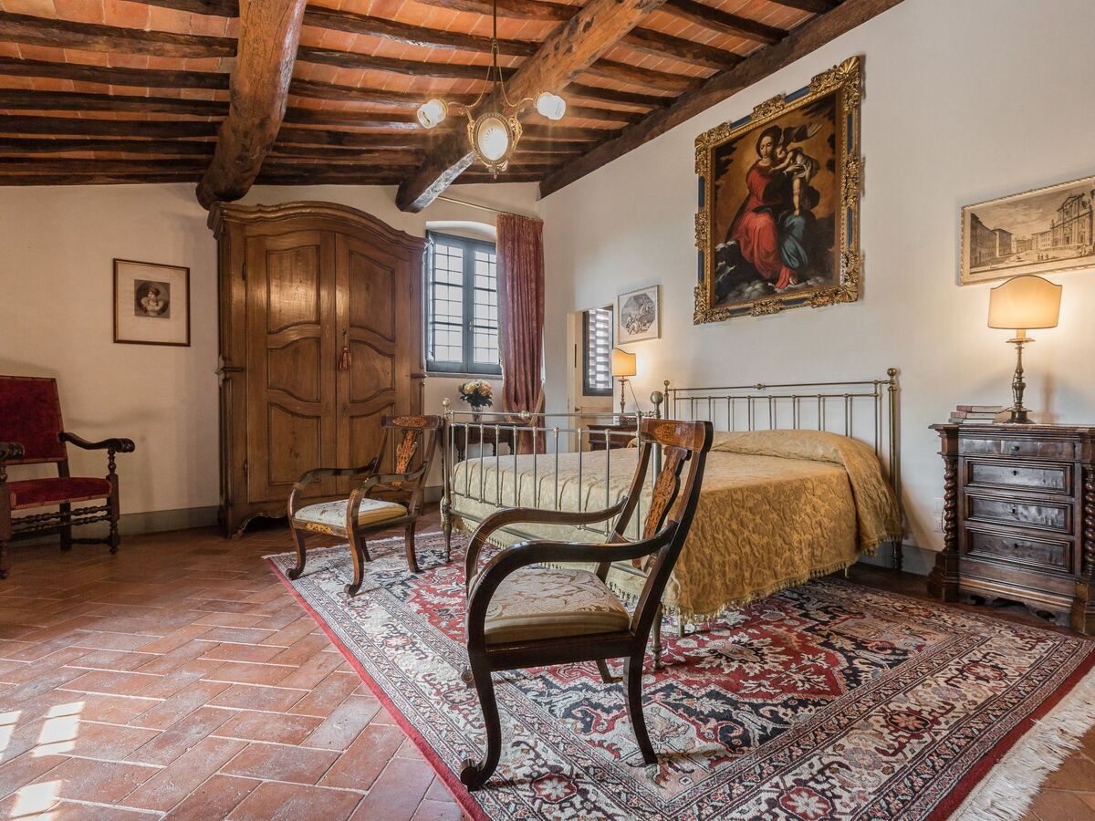 On the ground floor there is a large living-dining room (80 square metres) with a table for 14 and a magnificent 16th century fireplace (not in use), sloping ceilings with wooden beams and French windows overlooking the garden with views of the historic centre of Monsummano Alto; A further living room with satellite TV (Netflix, Bose Bluetooth acoustic speakers) and a double sofa bed and a single bed leads to the large Tuscan kitchen with fireplace (fully equipped with professional hob with 2 ovens, side-by-side refrigerator with icemaker, dishwasher, microwave, Nespresso coffee machine, American coffee machine, moka coffee maker, toaster, blender, juicer), a cast-iron stove with ovens and a French window leading to the veranda suitable for outdoor dining with a table seating 14 a double bedroom with a 17th-century fireplace (not in use) and French doors leading to a covered veranda; a bathroom with a hydro-massage shower; and a laundry room with a washing machine and dryer.