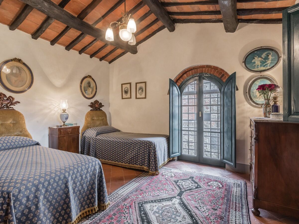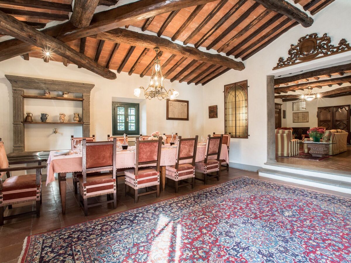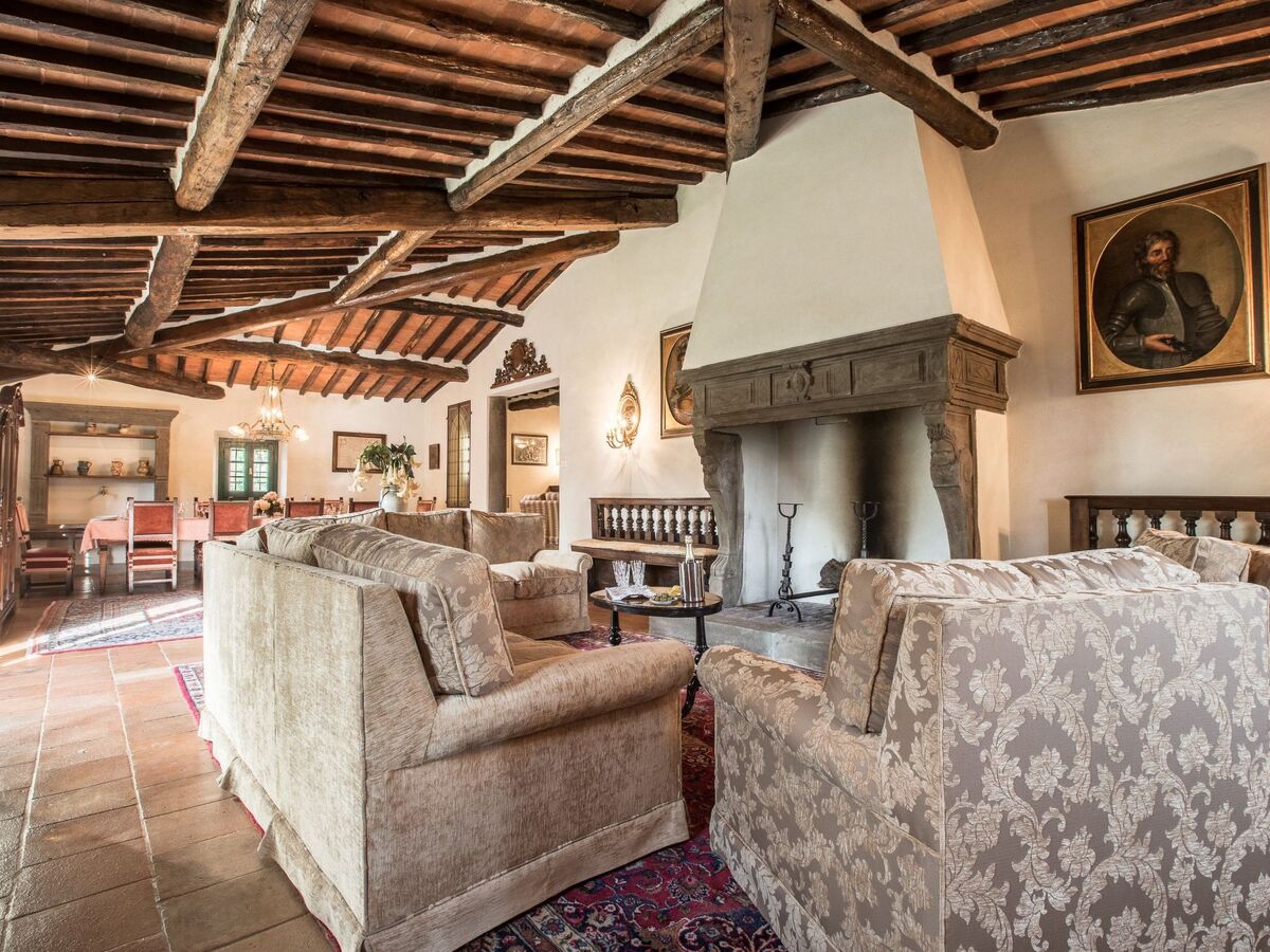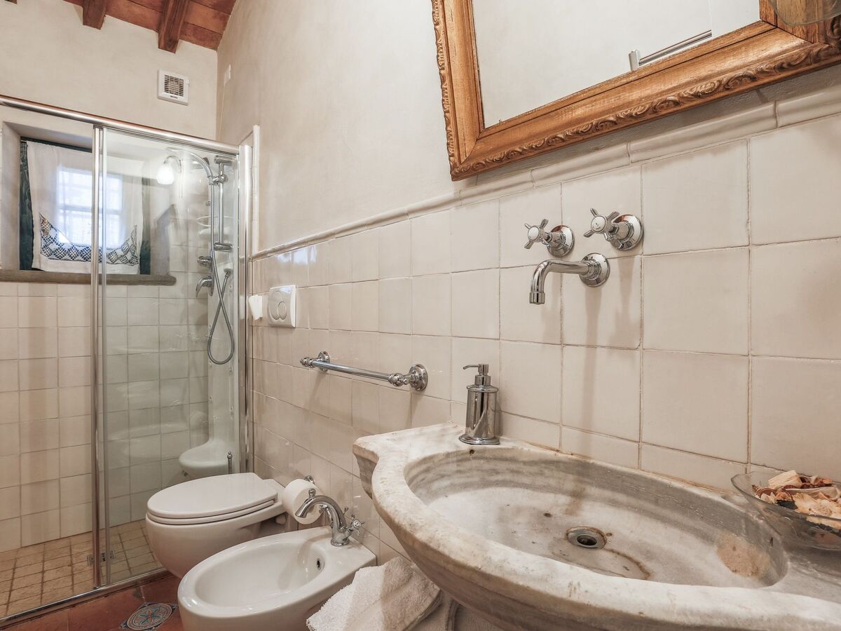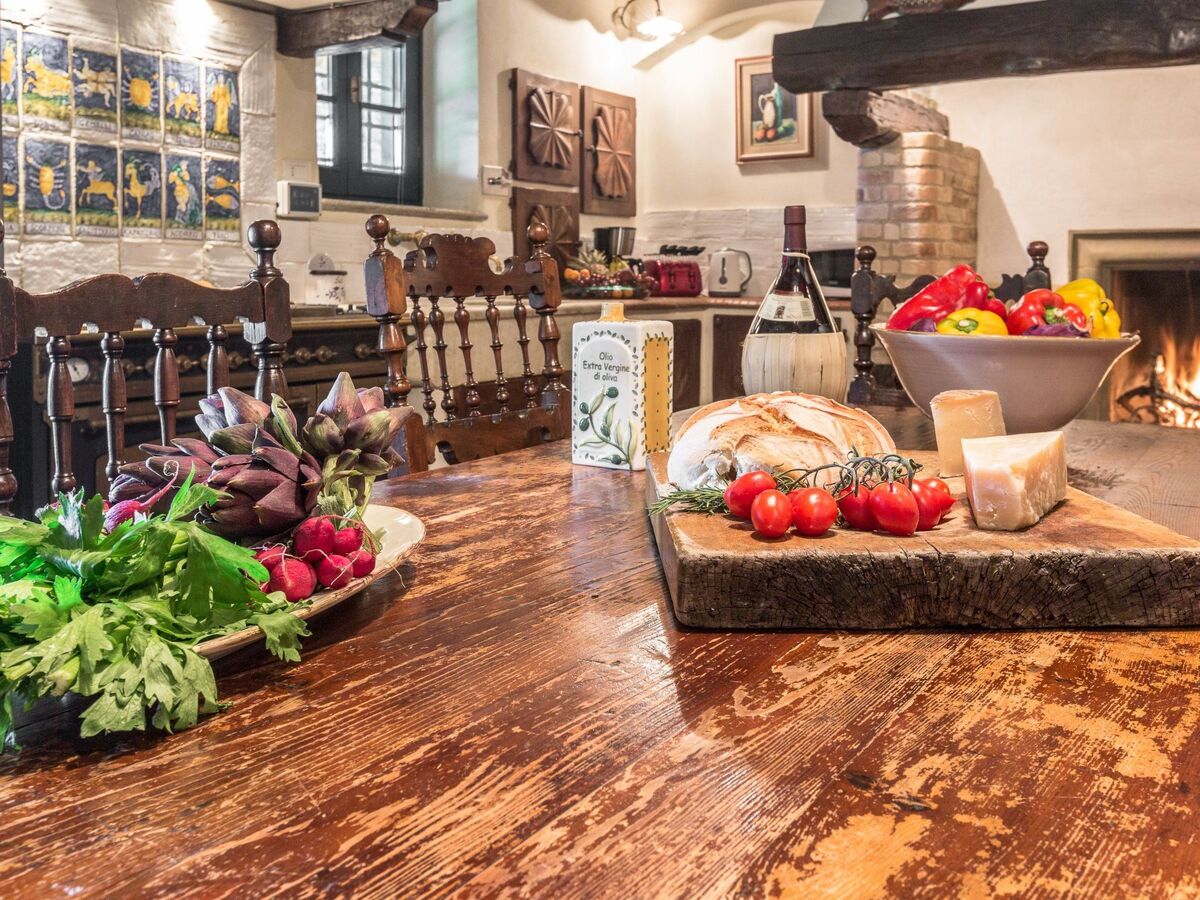 On the ground floor there is a large living-dining room (80 square metres) with a table for 14 and a magnificent 16th century fireplace (not in use), sloping ceilings with wooden beams and French windows overlooking the garden with views of the historic centre of Monsummano Alto; A further living room with satellite TV (Netflix, Bose Bluetooth acoustic speakers) and a double sofa bed and a single bed leads to the large Tuscan kitchen with fireplace (fully equipped with professional hob with 2 ovens, side-by-side refrigerator with icemaker, dishwasher, microwave, Nespresso coffee machine, American coffee machine, moka coffee maker, toaster, blender, juicer), a cast-iron stove with ovens and a French window leading to the veranda suitable for outdoor dining with a table seating 14 a double bedroom with a 17th-century fireplace (not in use) and French doors leading to a covered veranda; a bathroom with a hydro-massage shower; and a laundry room with a washing machine and dryer.