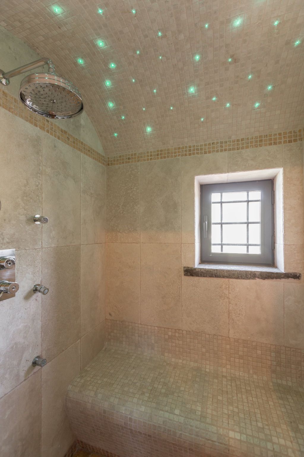 From the entrance hall, a stone staircase leads to the first floor, where there is a large double bedroom (30 m²) with en-suite bathroom with Turkish bath/shower, another double bedroom and a twin bedroom (which can be converted into another double bed), both sharing a bathroom with whirlpool tub and shower with chromotherapy and aromatherapy kit.