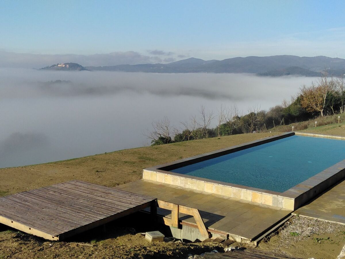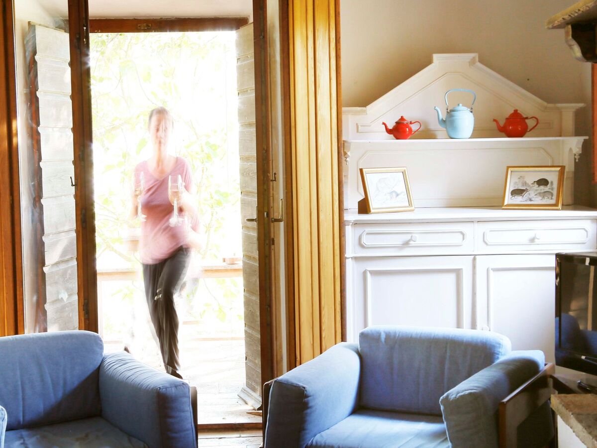 An internal staircase connects to the ground floor, with a studio-bedroom and a large kitchen with fireplace.