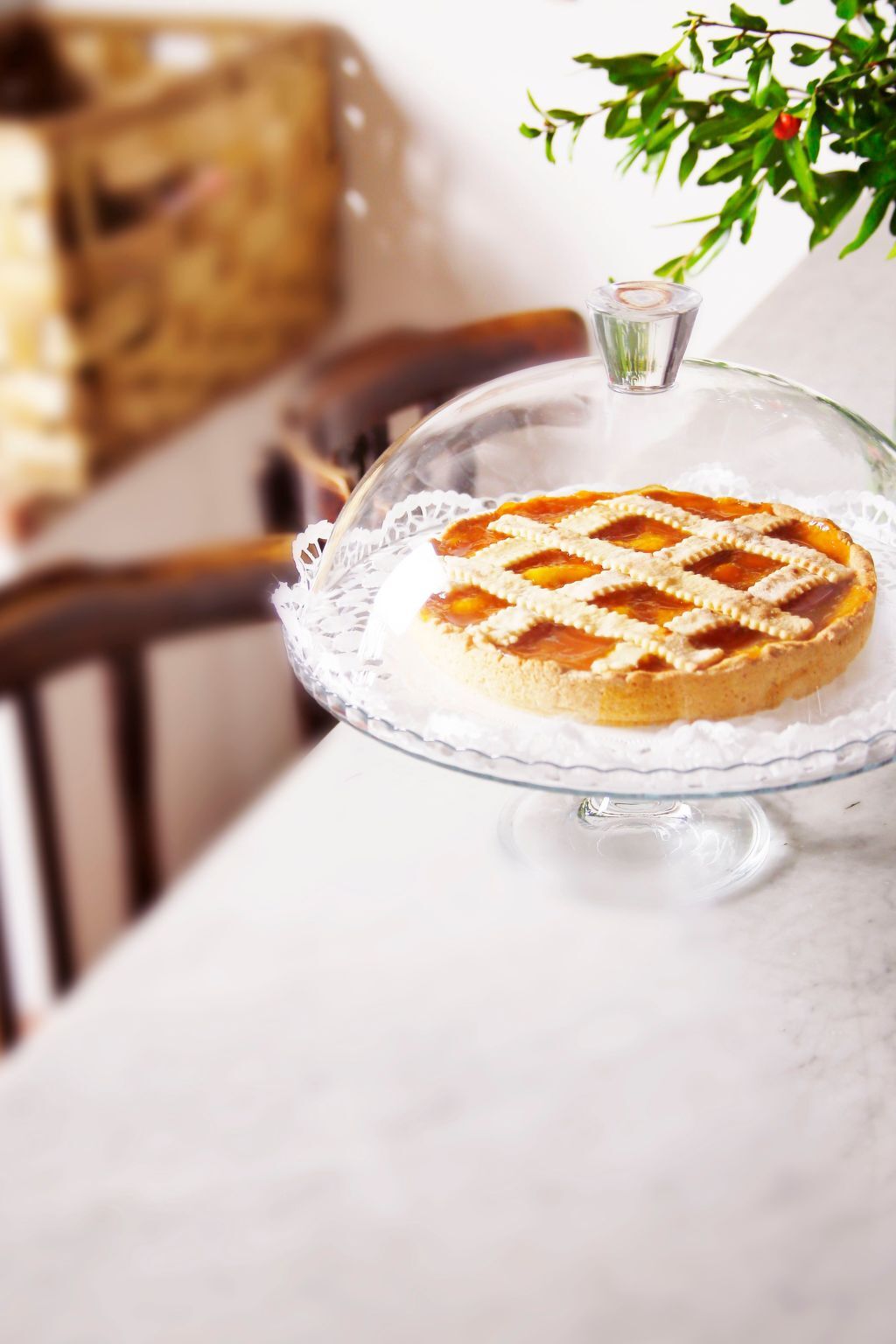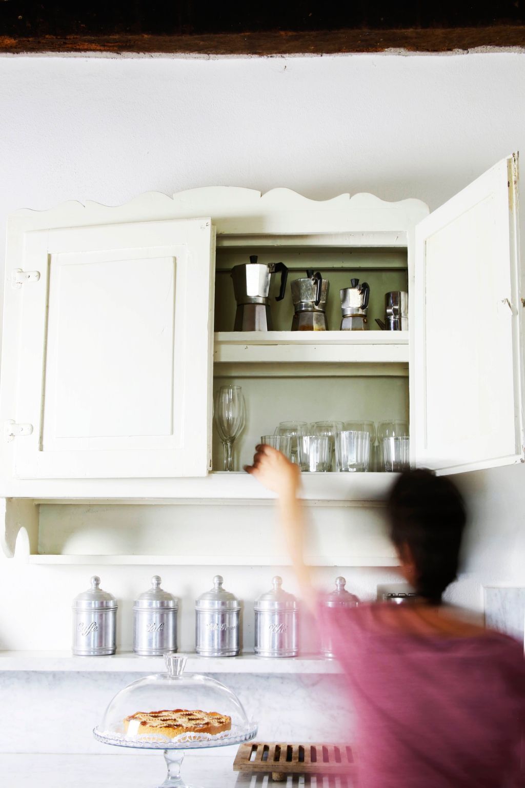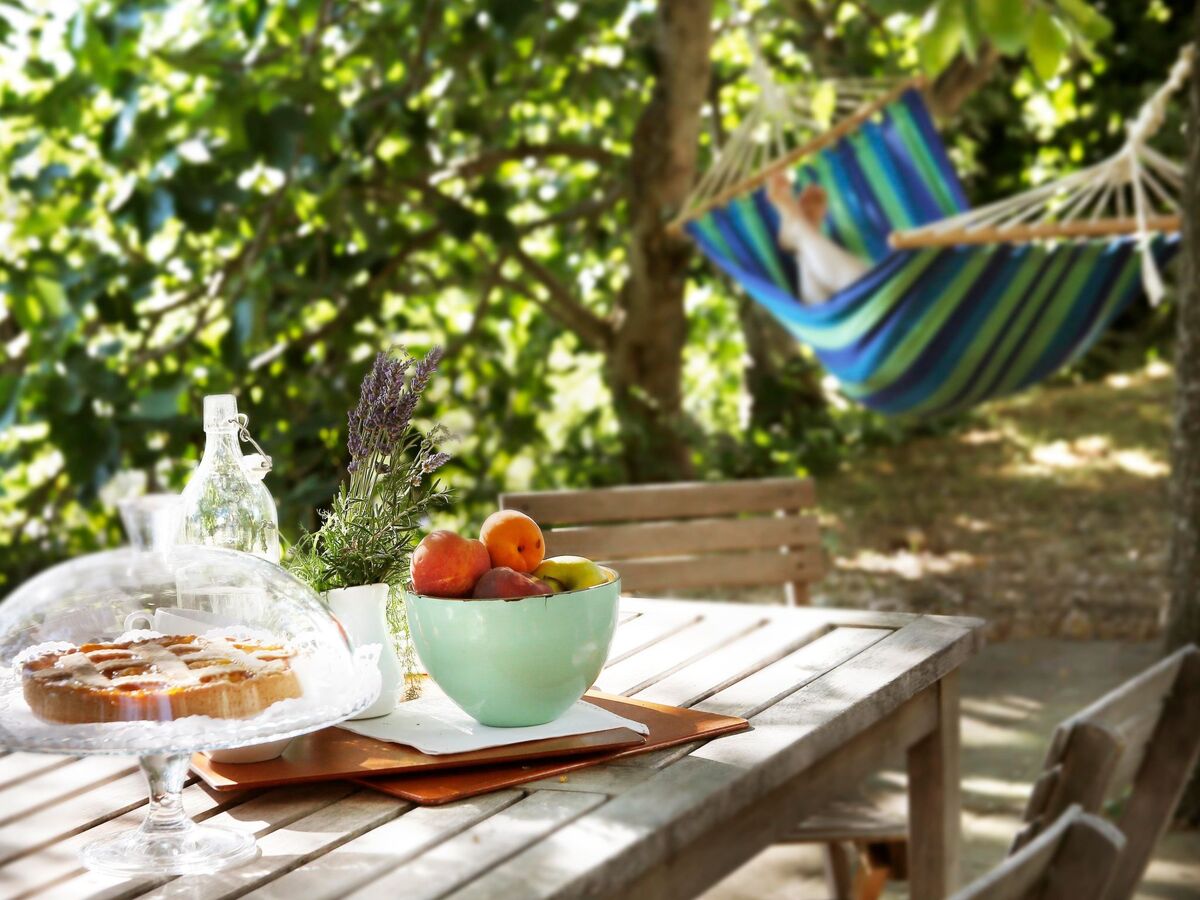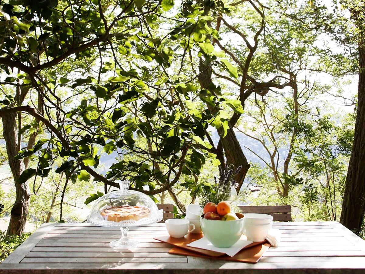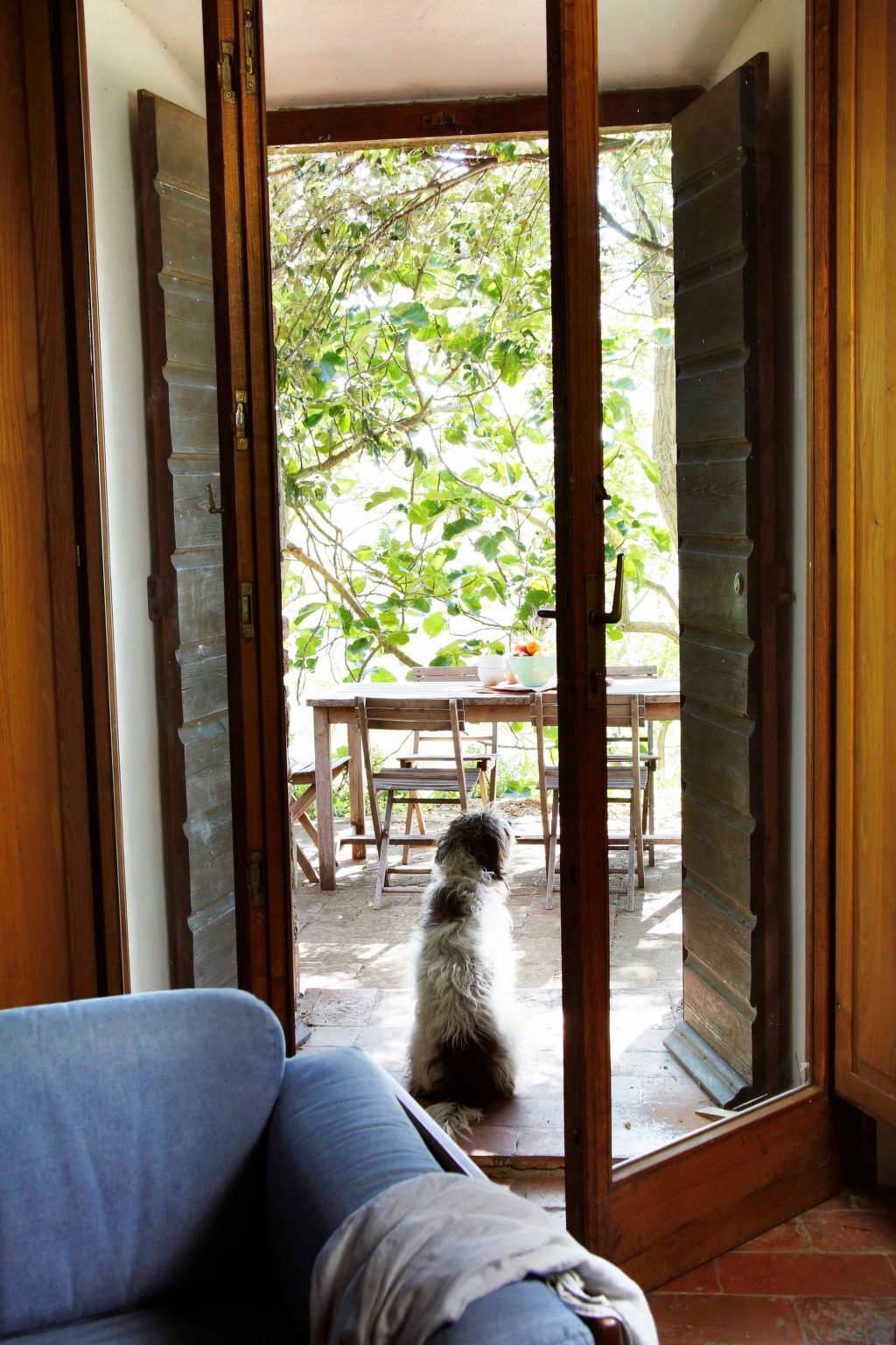 Through the kitchen one reaches the terracotta terrace towards the valley, shaded by acacias.