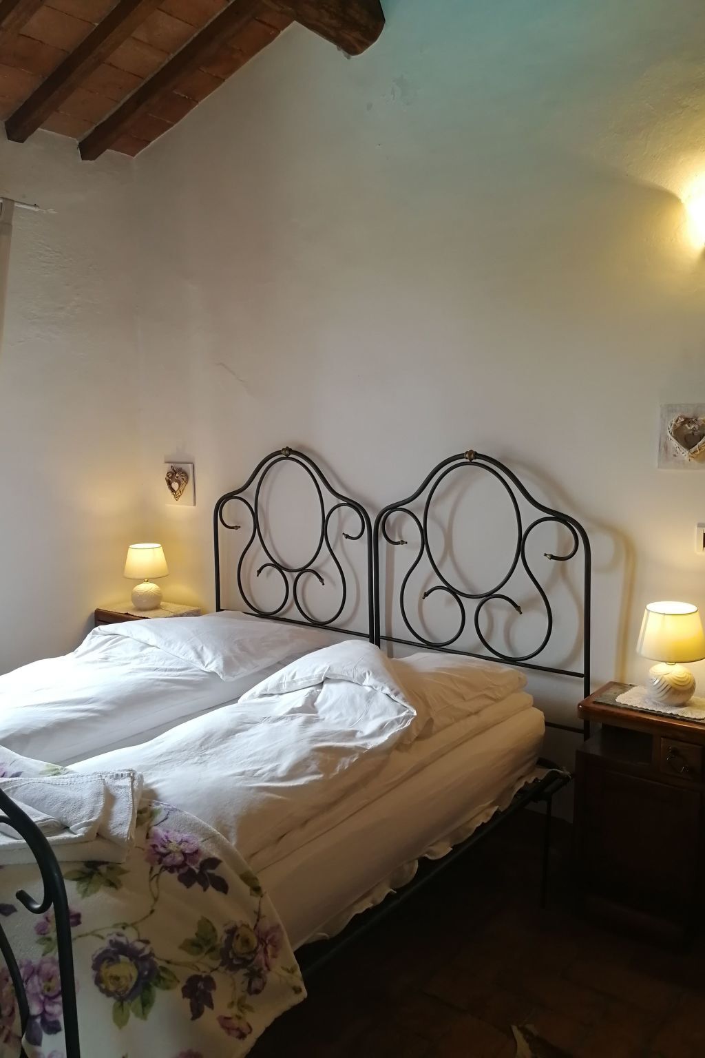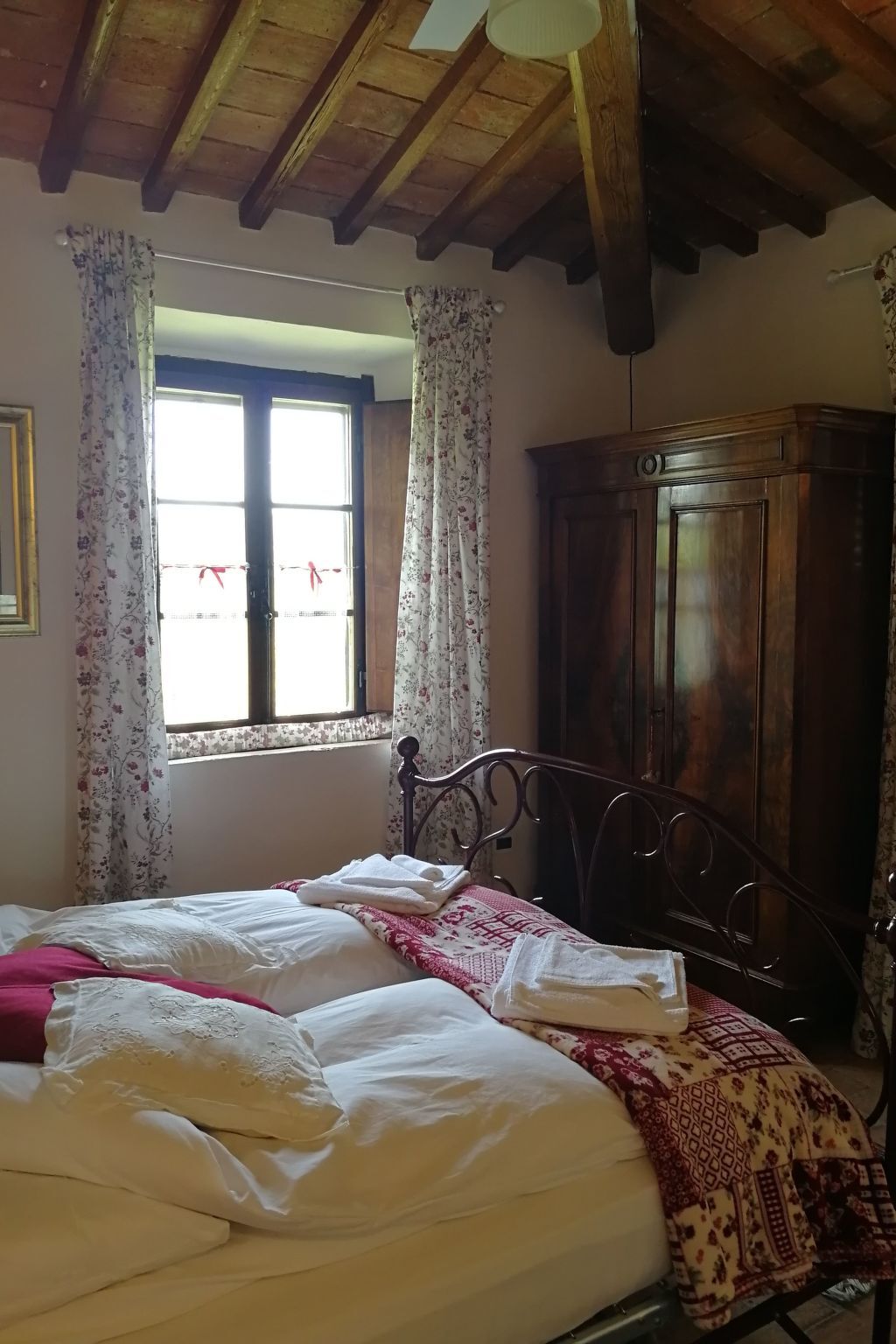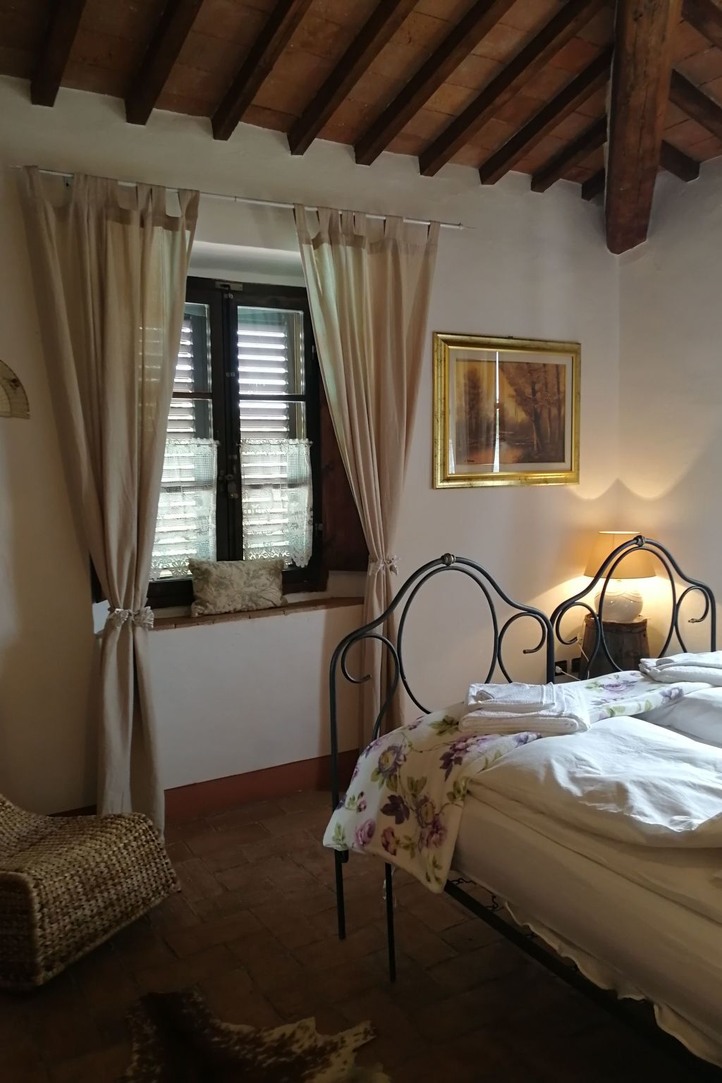 There are also two cosy and bright bedrooms, each with a double bed, and a bathroom with bathtub, from whose window you can admire Monte Cetona.