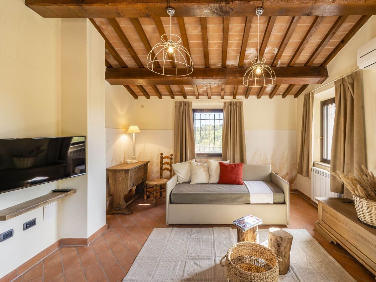 Also from this second floor, a stone staircase leads to the first floor, where there is a large living room with two comfortable single sofa beds, a Smart TV, a large bedroom (bed 160 x 200 cm) and a bathroom with shower.