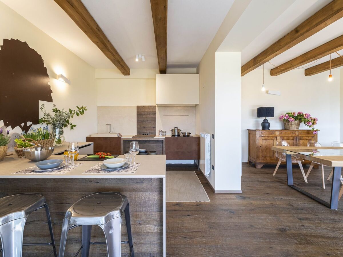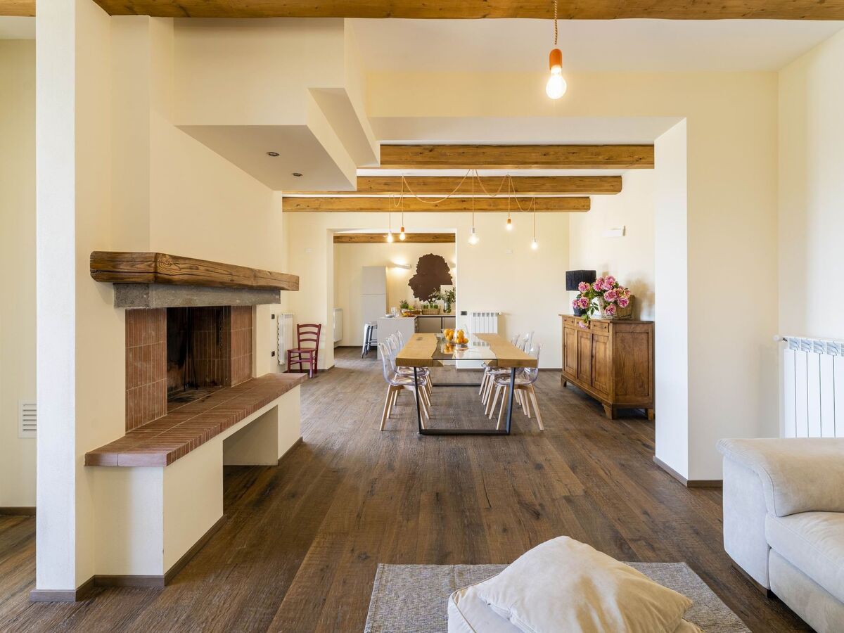 The other large veranda on the basement floor, which can be opened electronically, leads to one of the entrances to the house, where there is a large living room with a living area (fireplace, Smart TV), worktop, dining area with a table seating 10 and a large kitchenette (induction hob, oven, fridge with freezer, dishwasher, microwave, toaster, moka).