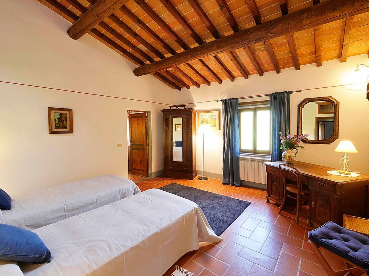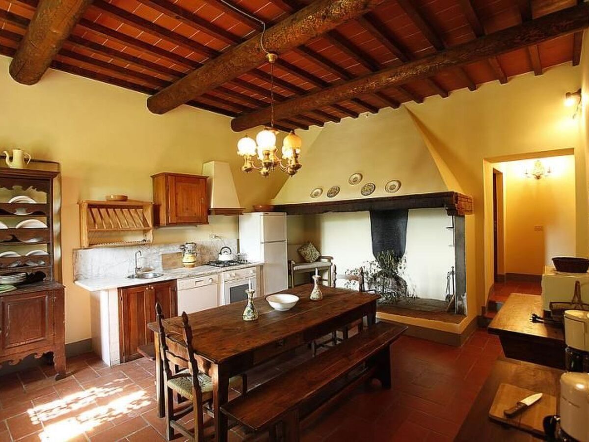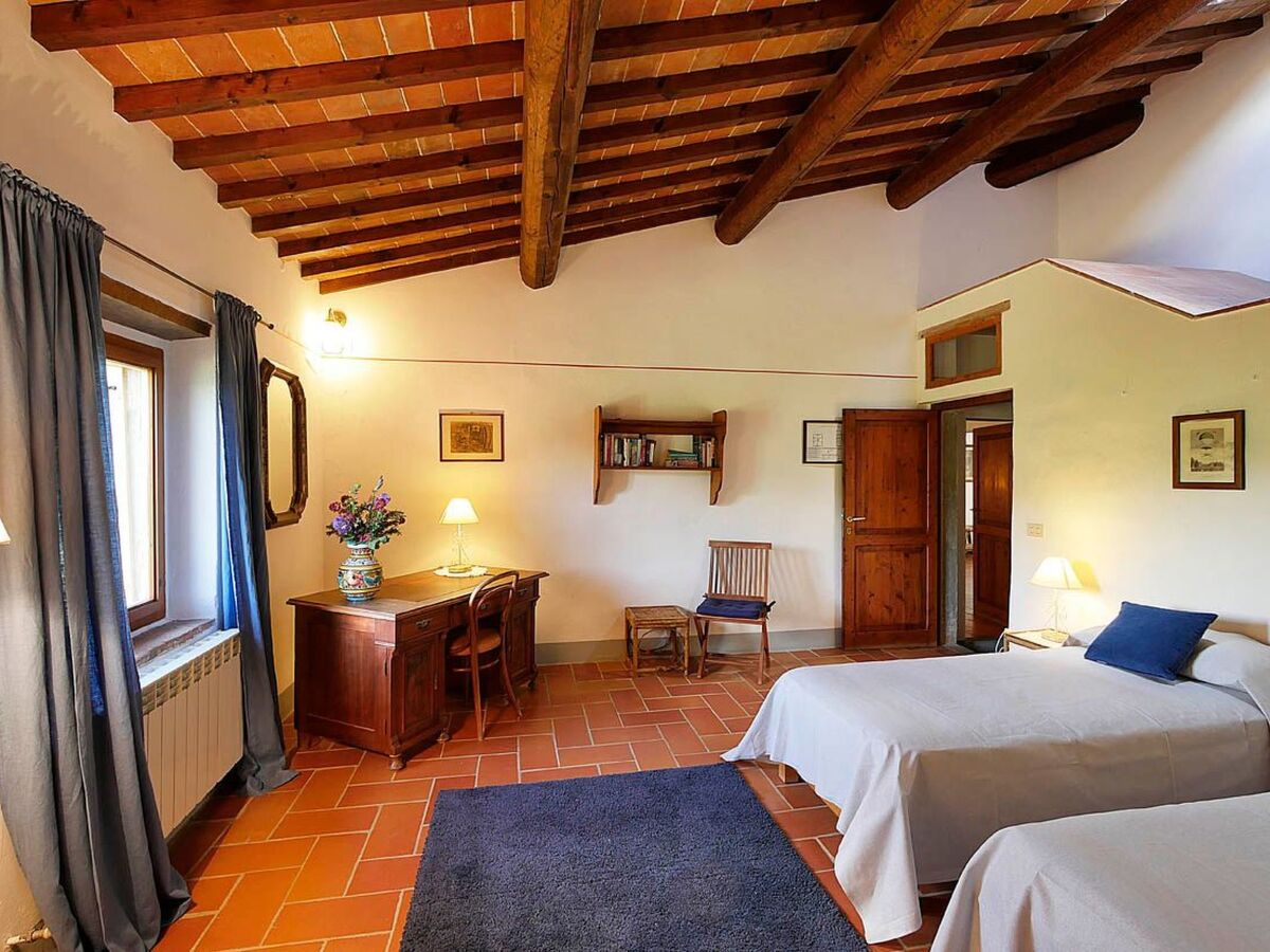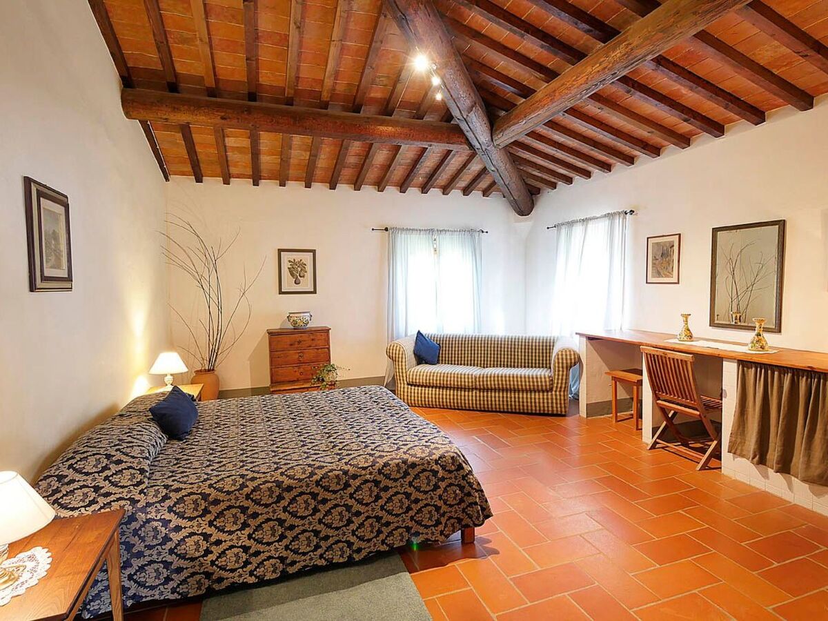 Il s'agit d'une ferme toscane typique avec des poutres apparentes et des sols en terre cuite.
