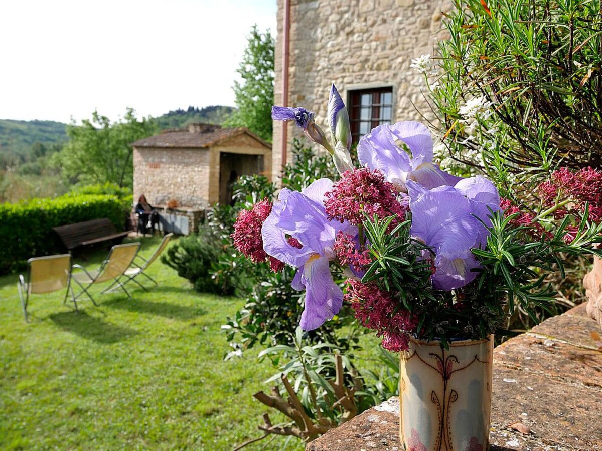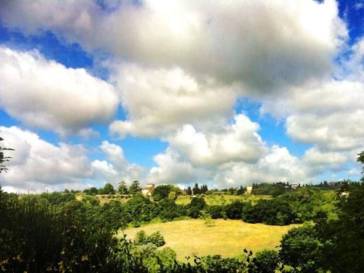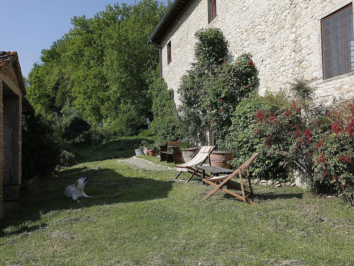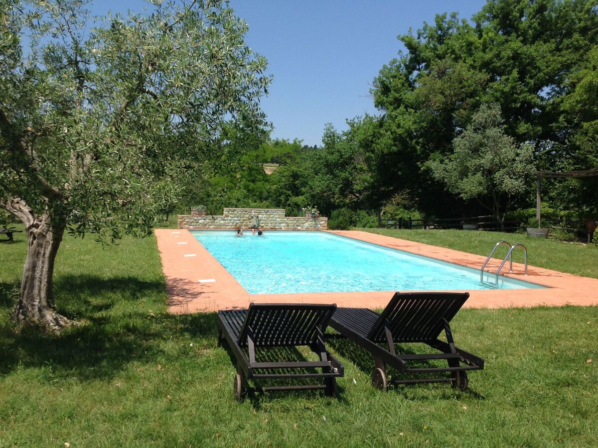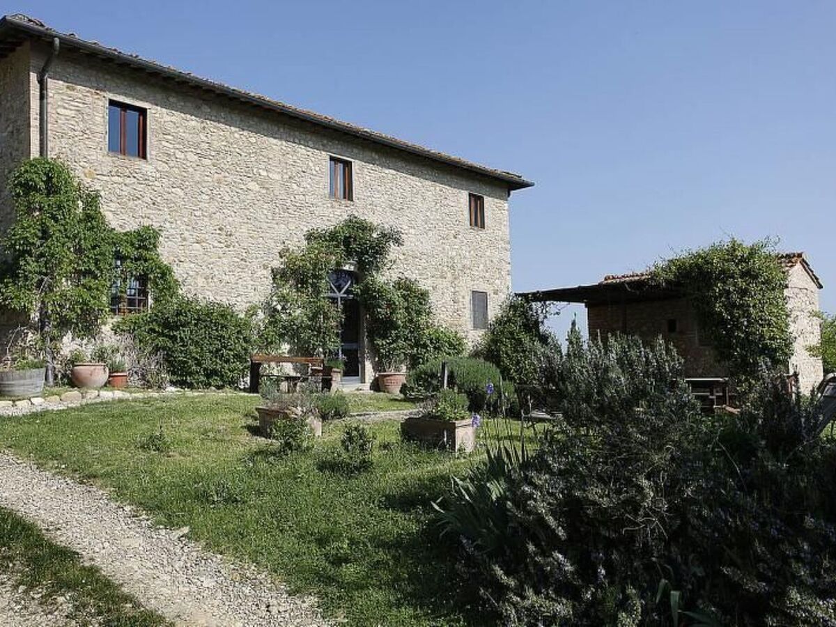 Il s'agit d'une ferme toscane typique avec des poutres apparentes et des sols en terre cuite.