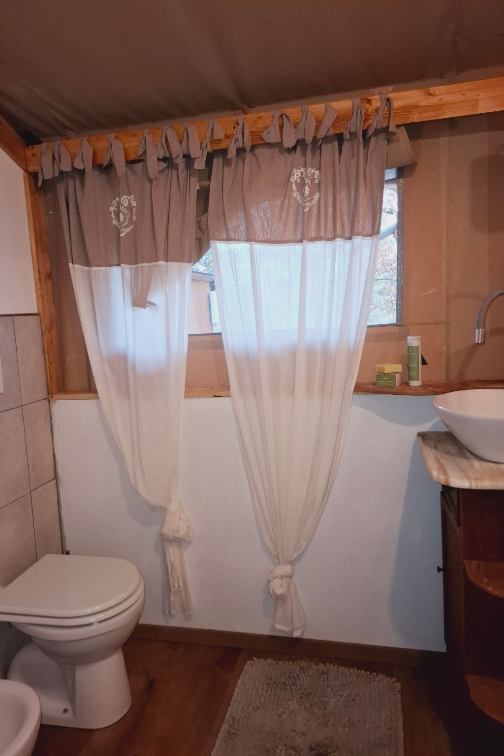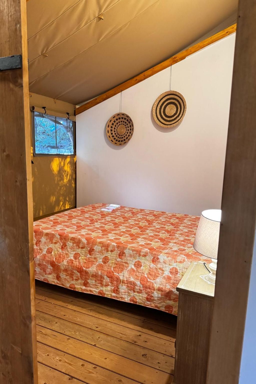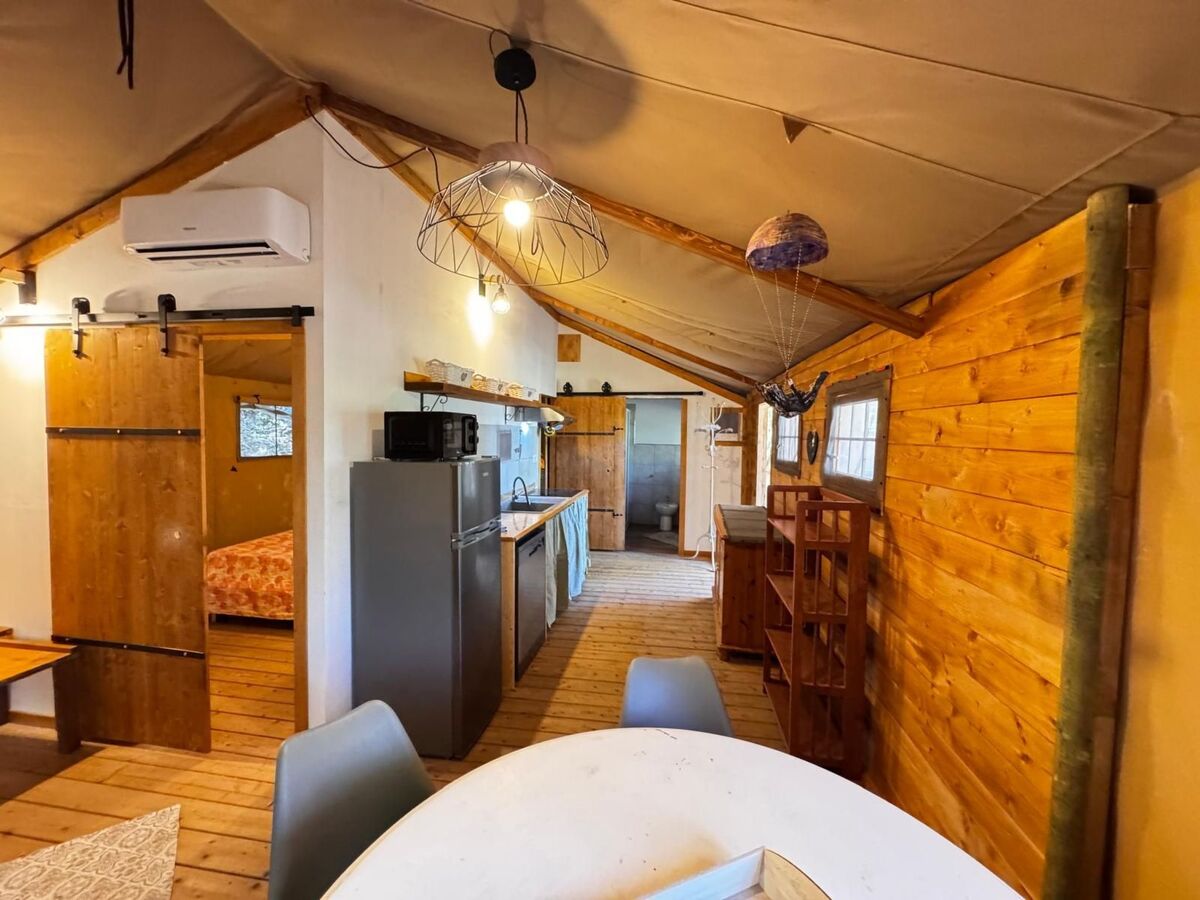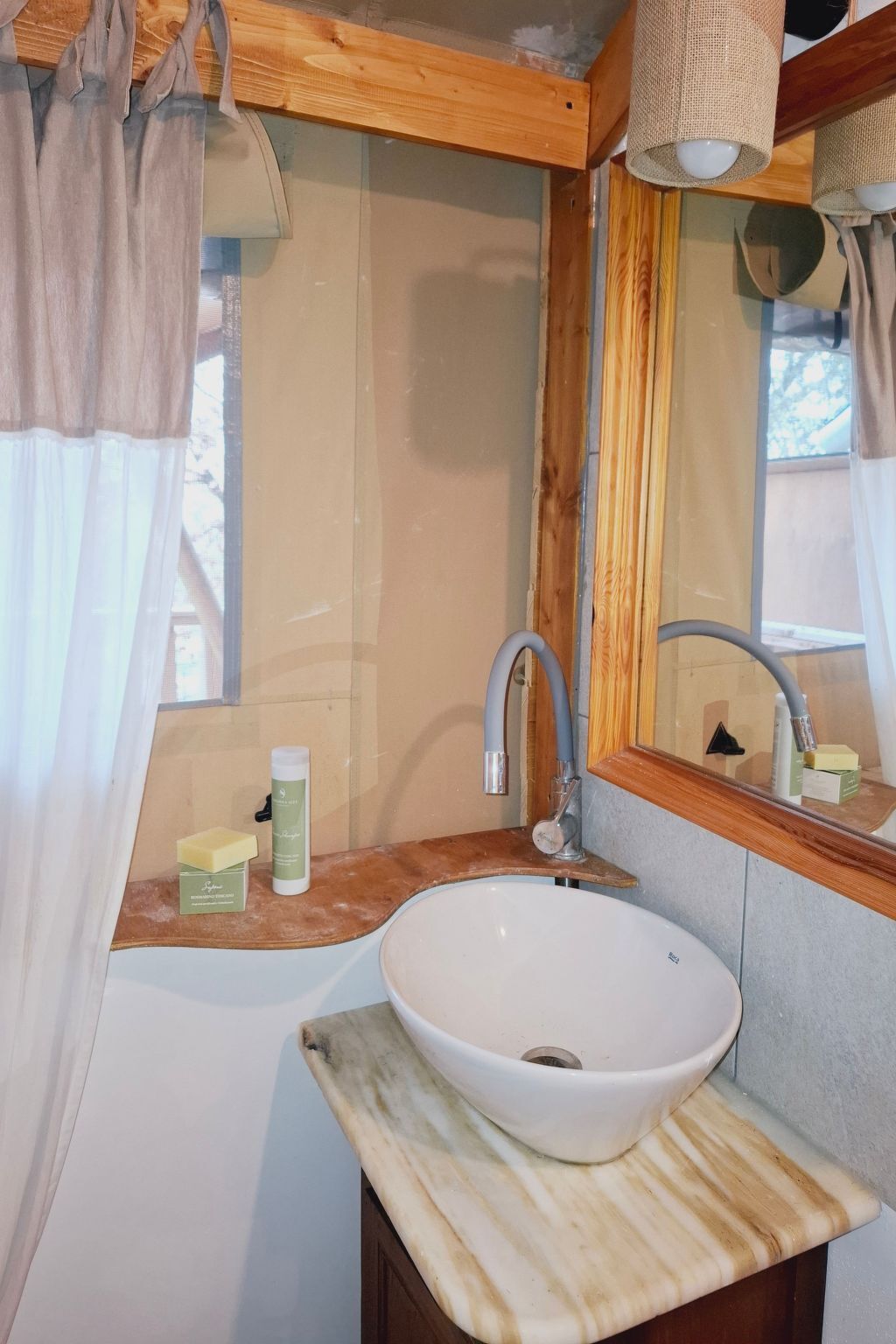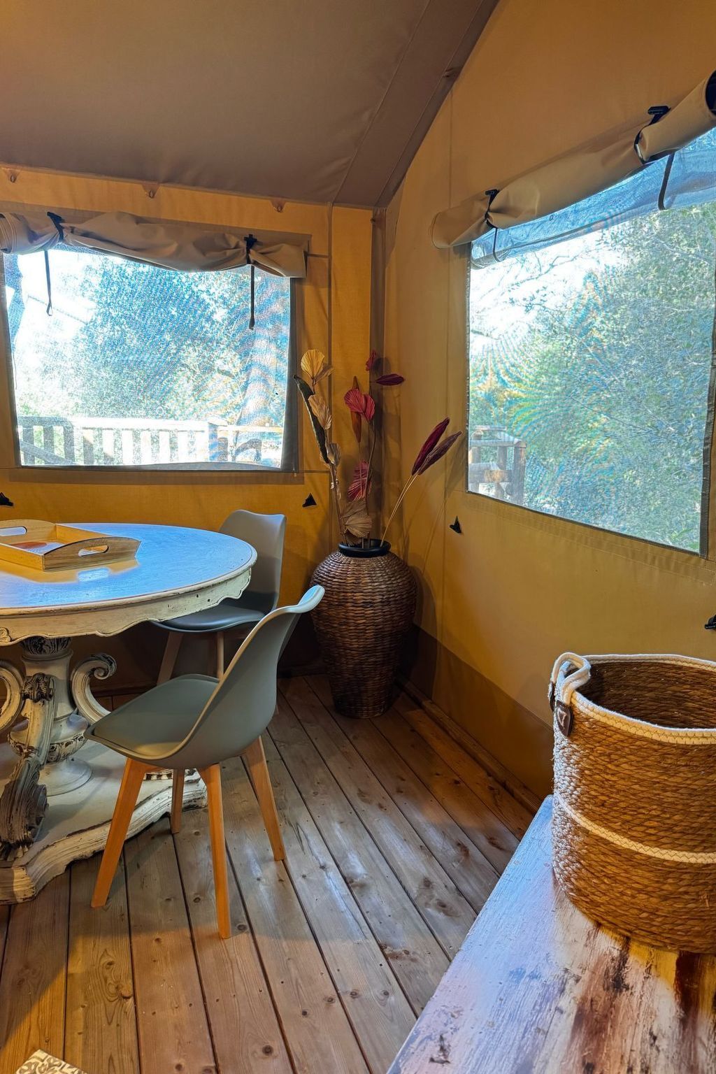 These are to all intents and purposes tents, but spacious and equipped with all comforts, beds with mattress, air conditioning and private bathroom.