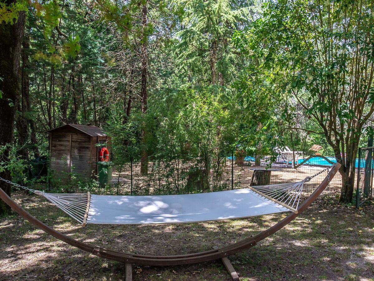 The pool is equipped with deckchairs but does not require sunshades as it is shaded by tall trees.