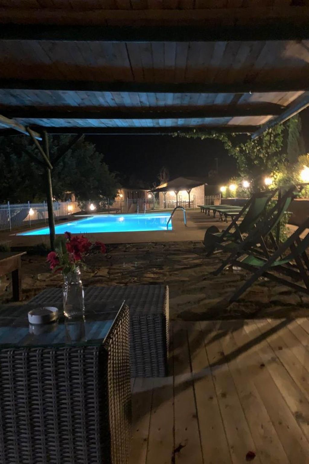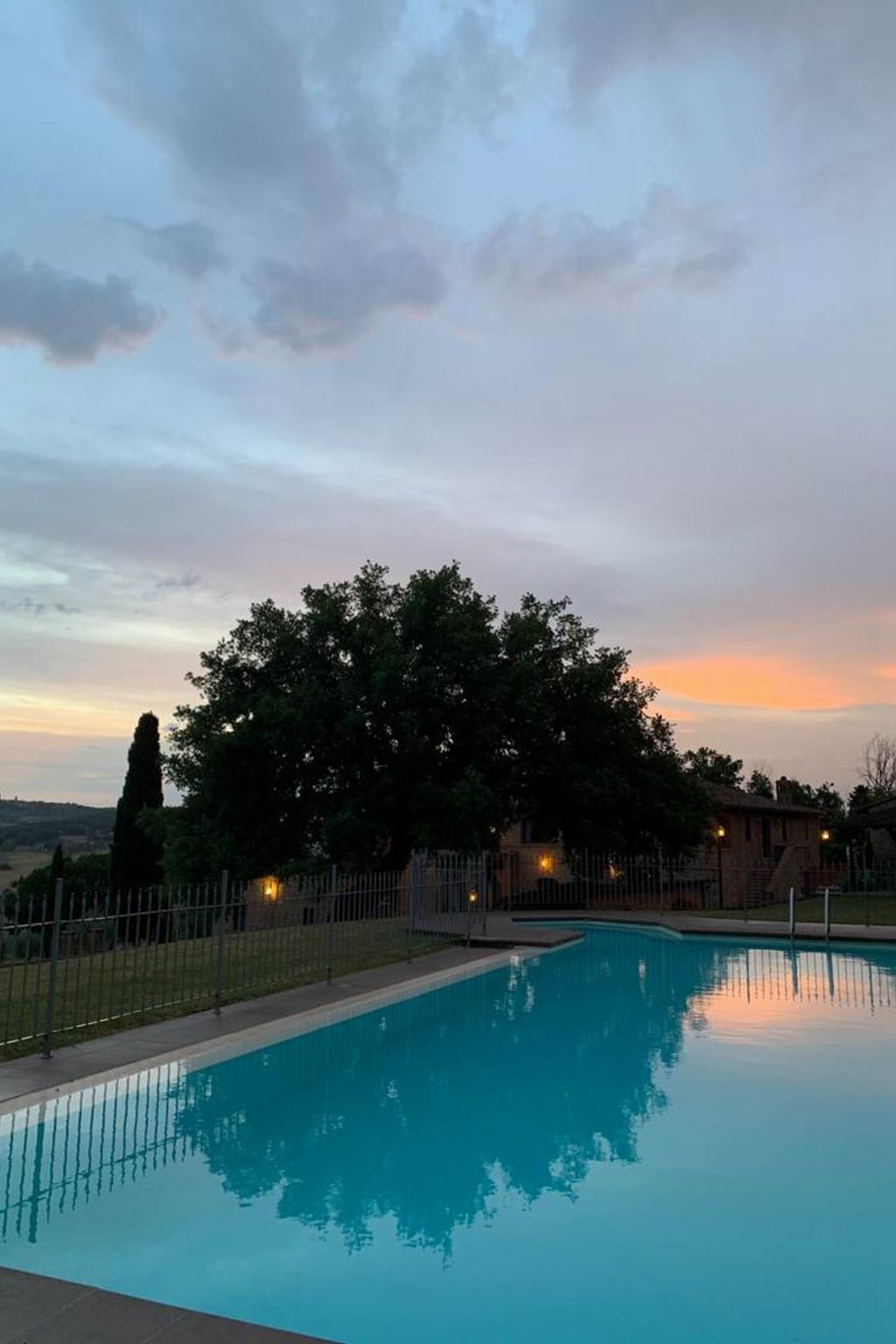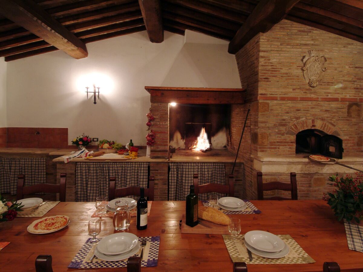 A covered dining area with a fireplace, pizza oven, barbecue, table and chairs allows guests to enjoy unforgettable Tuscan sunsets.