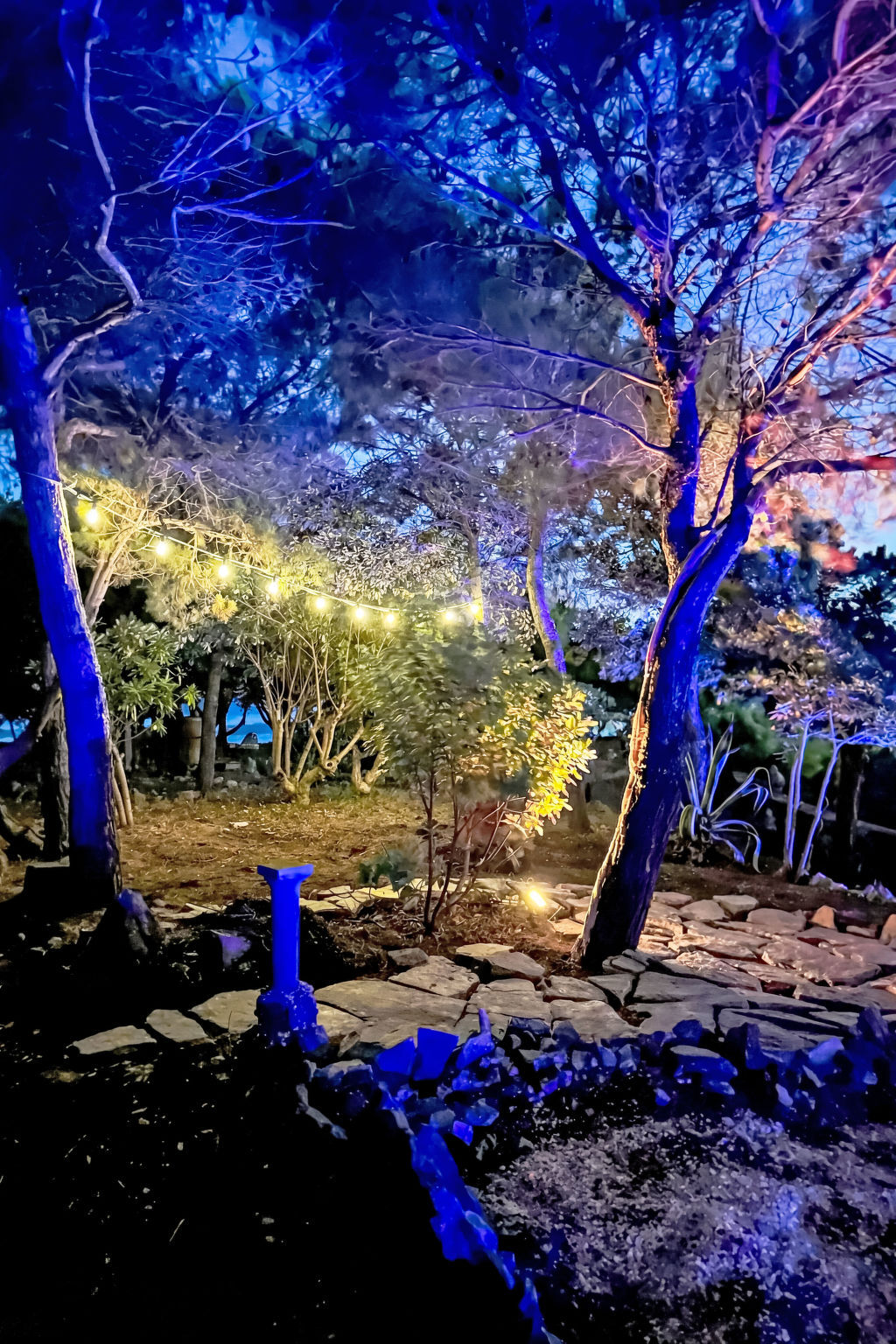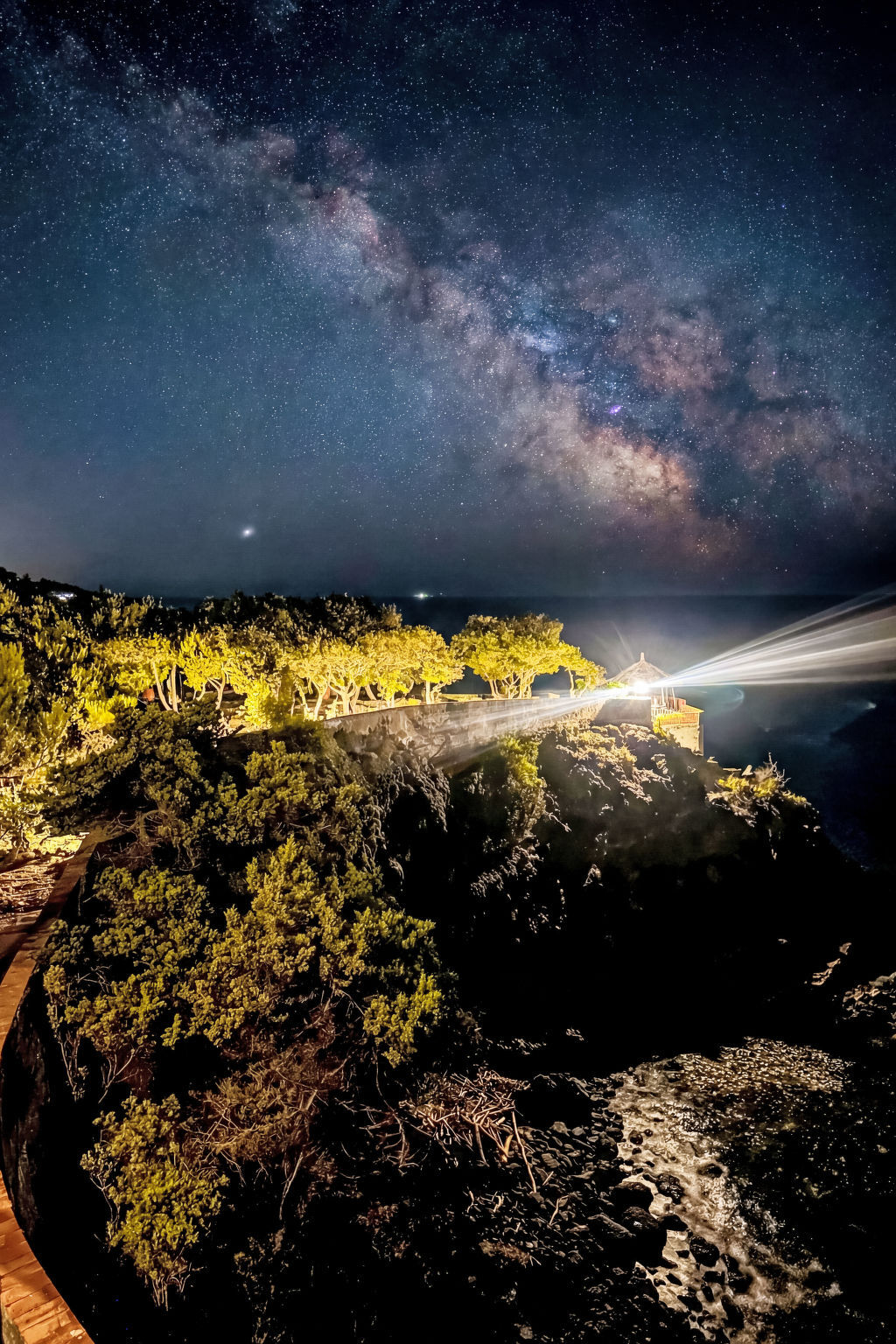 One leads to a secluded, sun-kissed rocky cove, the other to a hidden sandy beach, both accessible only through the villa's private park.
