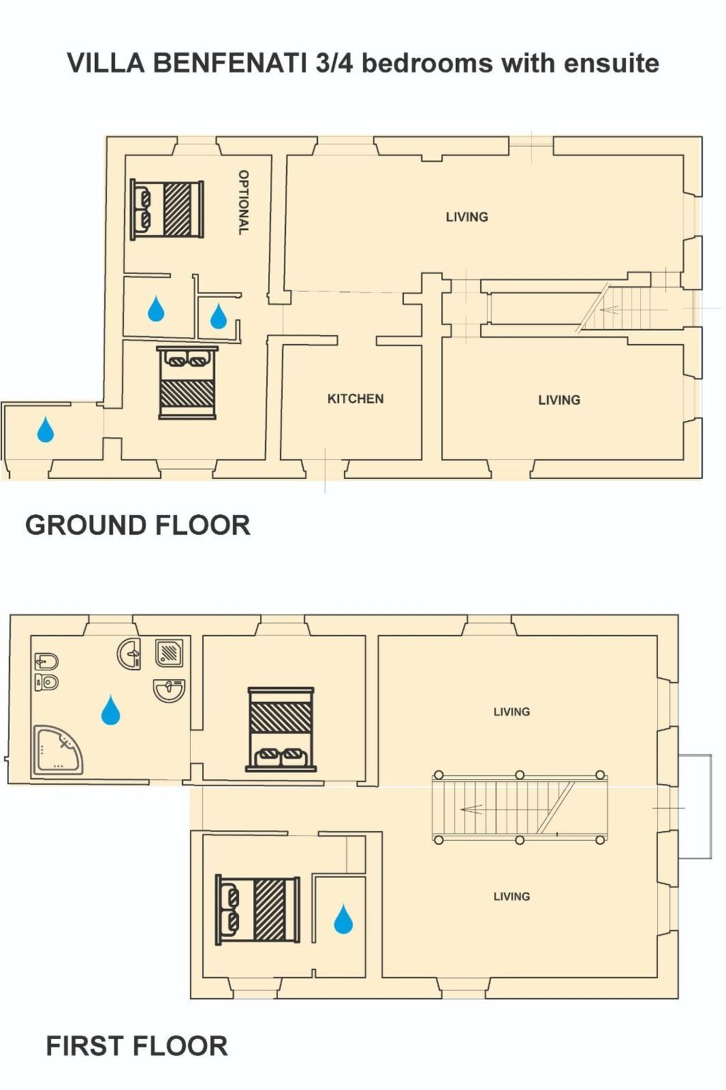 The first floor also comprises two bedrooms with a double bed and each with a private bathroom, of which one has a bath, shower, two washbasins and a toilet, while the other has a shower, toilet, bidet and washbasin.