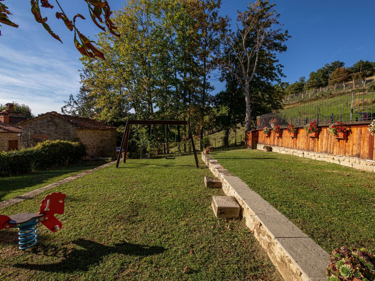 The imposing villa is surrounded by a private garden with tall trees, bordering on the National Park of the Casentino Forests.