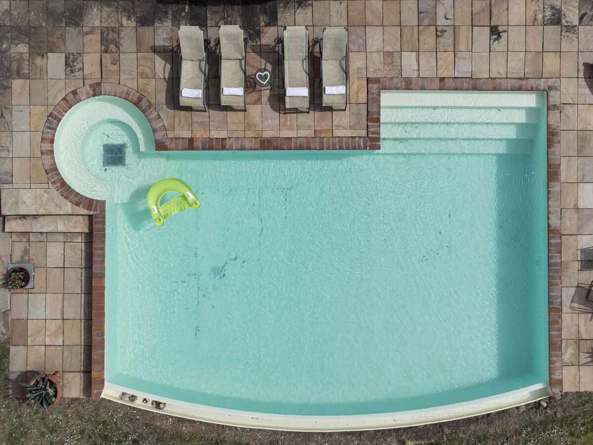 The beautiful swimming pool (10.5 x 7.5 m) with salt water system and whirlpool area, equipped with sun loungers, table and chairs, is surrounded by lawn and framed by rolling hills, an ideal place to relax and take a refreshing dip.