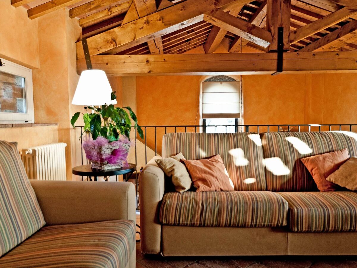 On the upper floor is an open gallery with fireplace and a spacious living room with two sofas (one of which is a sofa bed for two persons).