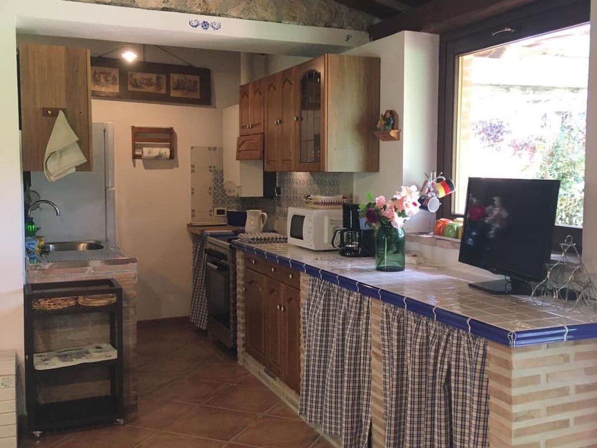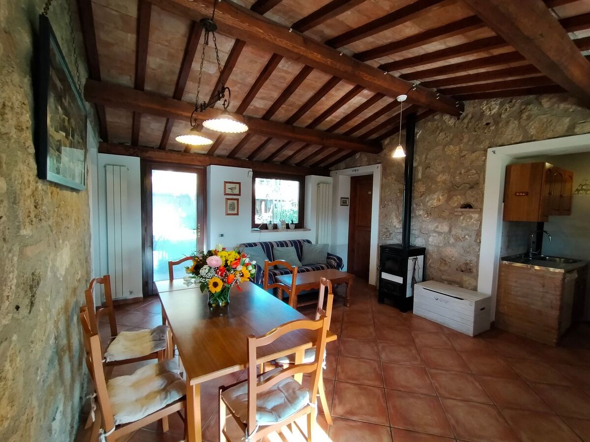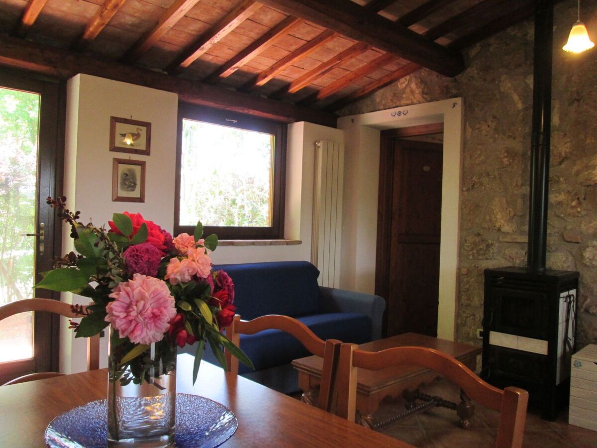 The kitchen is open onto the living room furnished with table and chairs, sofa bed and ceramic wood stove.