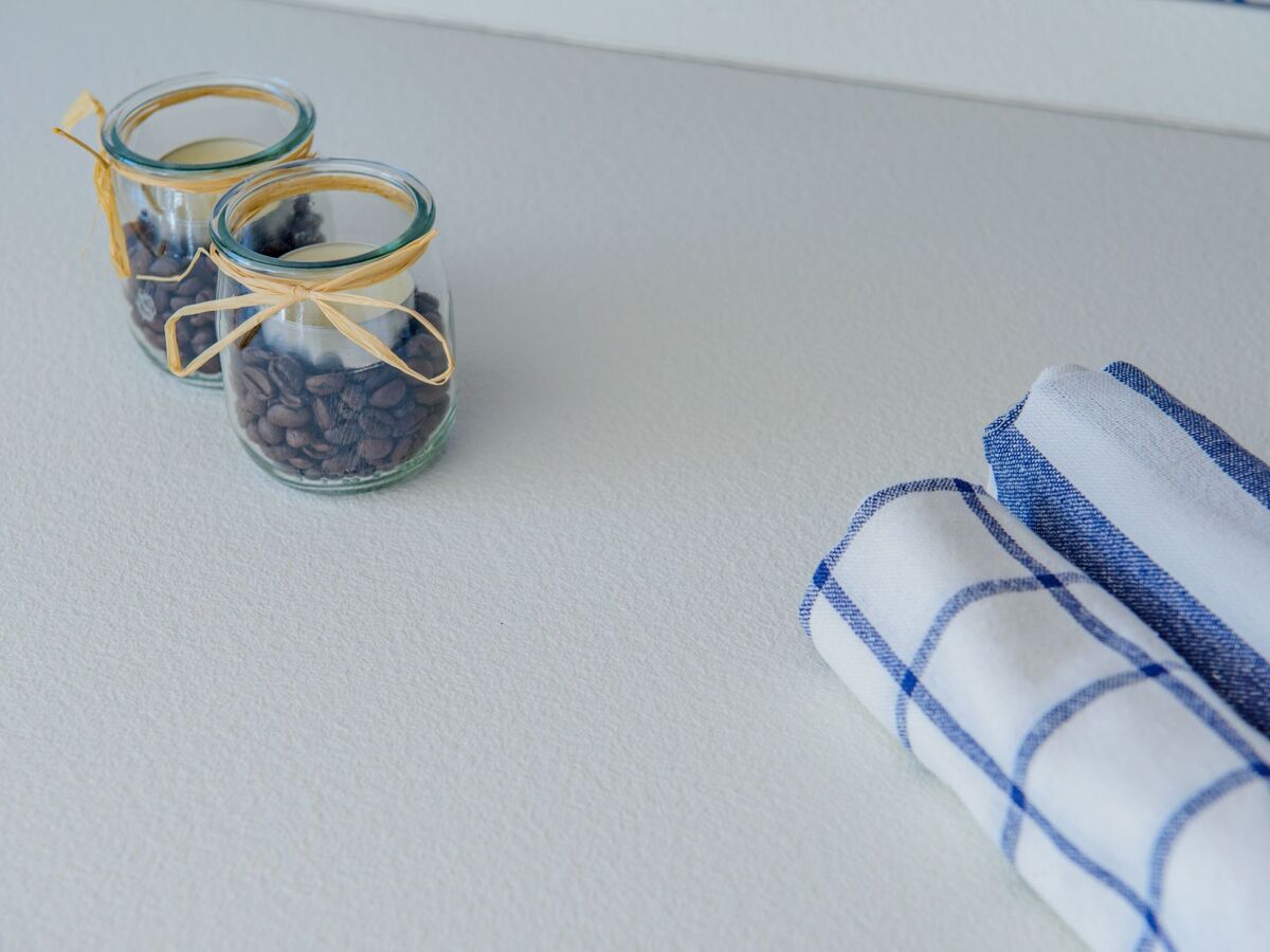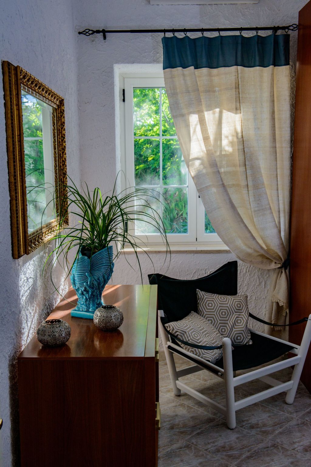 The refined majolica tiles on the hob reflect the sun's rays and illuminate the room.
