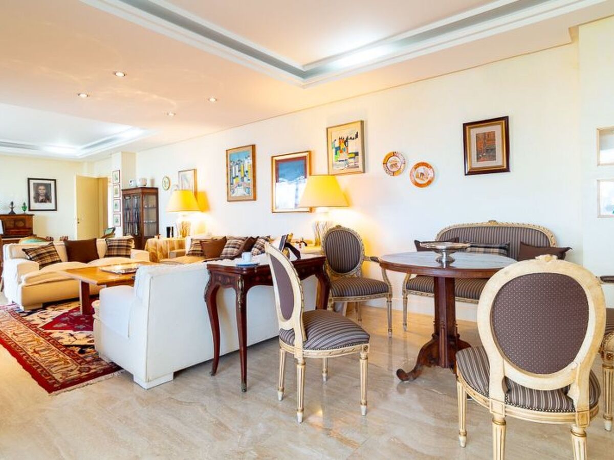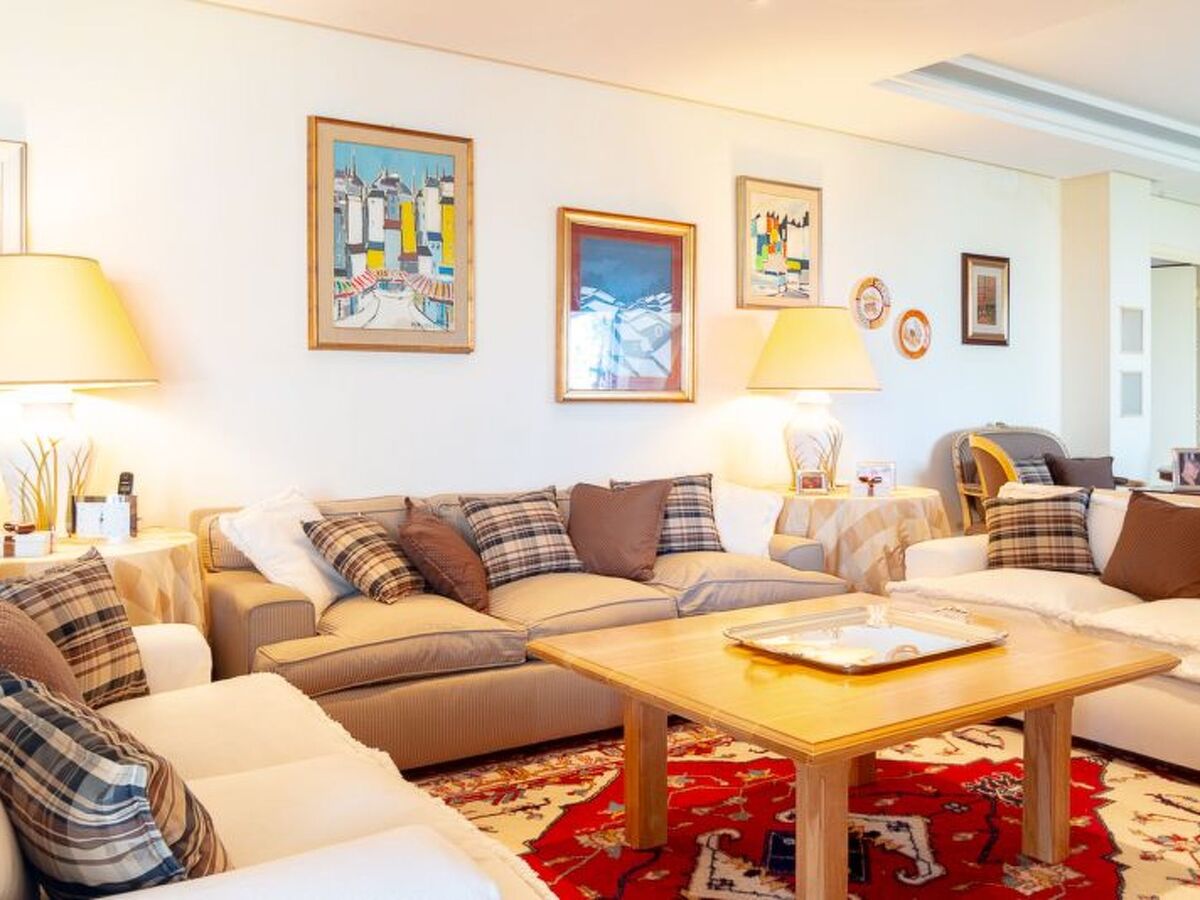 The large living room has sofas and armchairs for reading or conversation and overlooks a porch overlooking a beautiful garden.