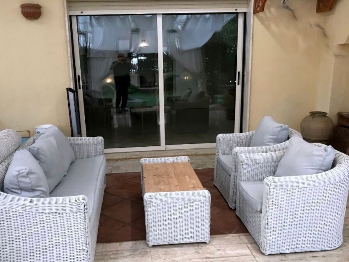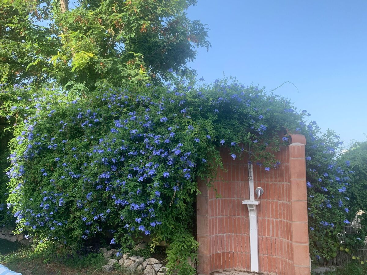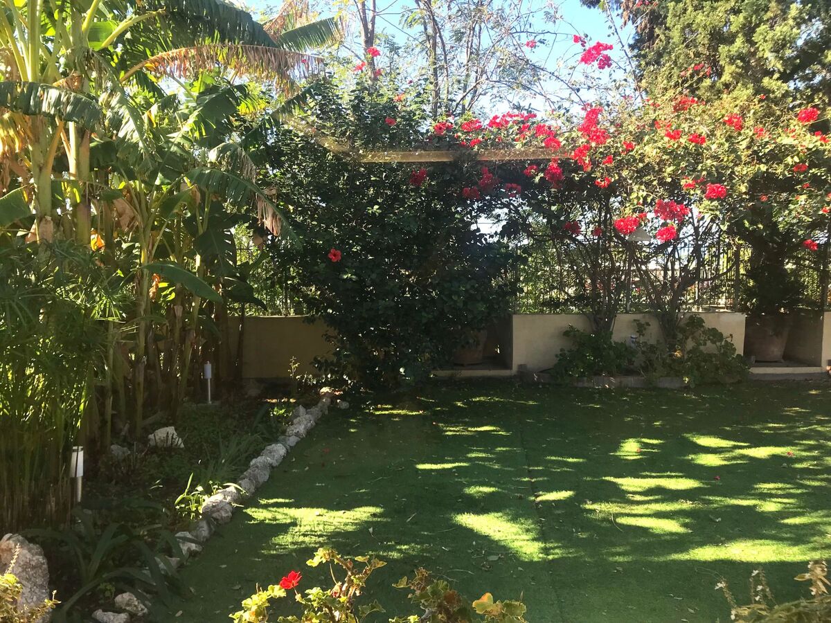 The House's large garden with palm trees, banana trees, bougainvilleas and blue jasmine is fenced off and equipped with chaise-longues.