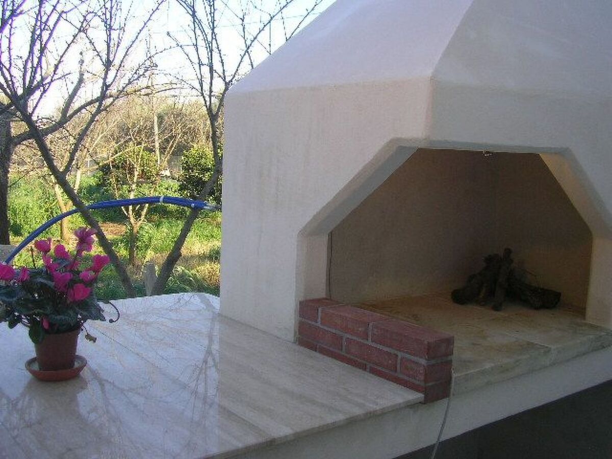 To enjoy the beautiful countryside, there is a barbecue with another large stone table with marble top next to it.