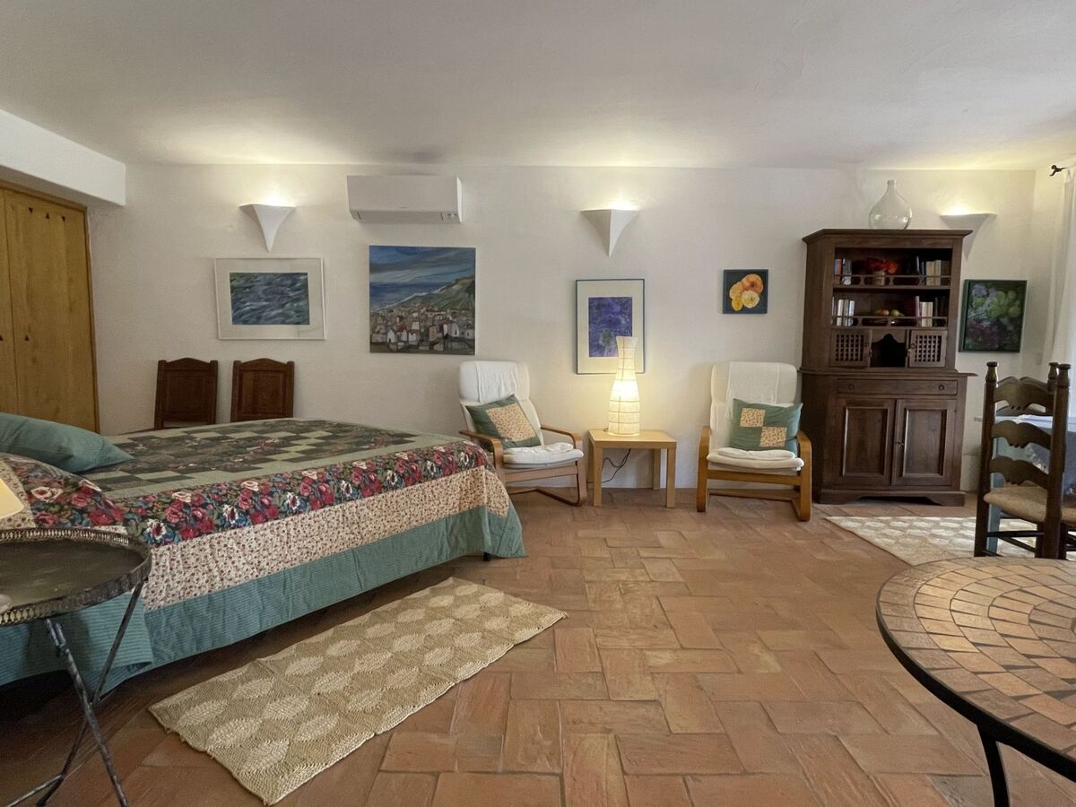 The flat has a partially covered terrace and its own entrance to the garden and pool.