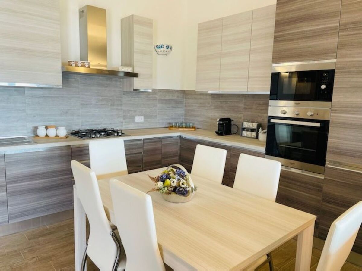 The large patio with a relaxation and dining area, introduces us to the flat where there is a large and modern fully equipped kitchen and a TV area.
