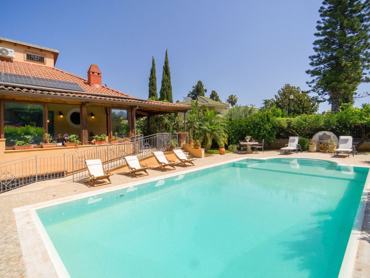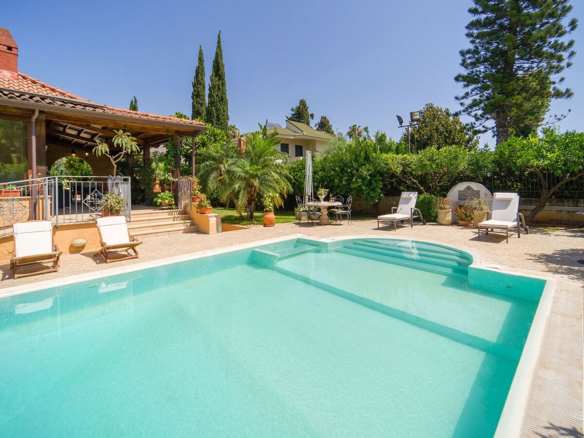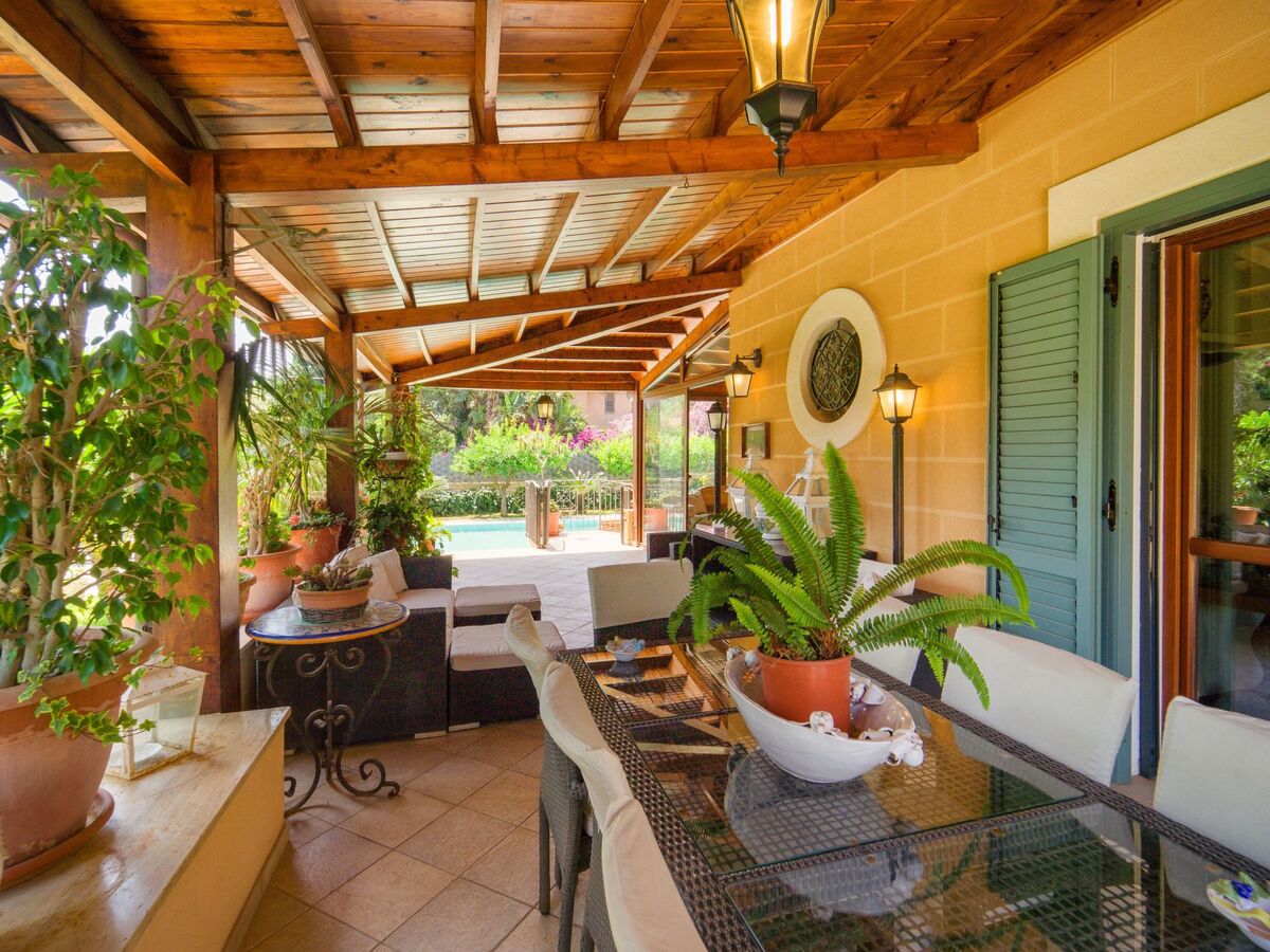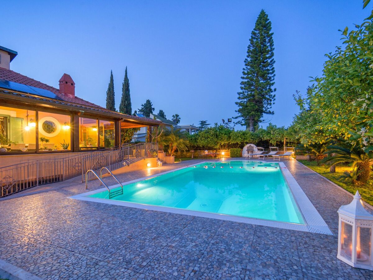The villa has a splendid swimming pool close to an elegant internal patio, part of which has a glass window overlooking the garden and the solarium.