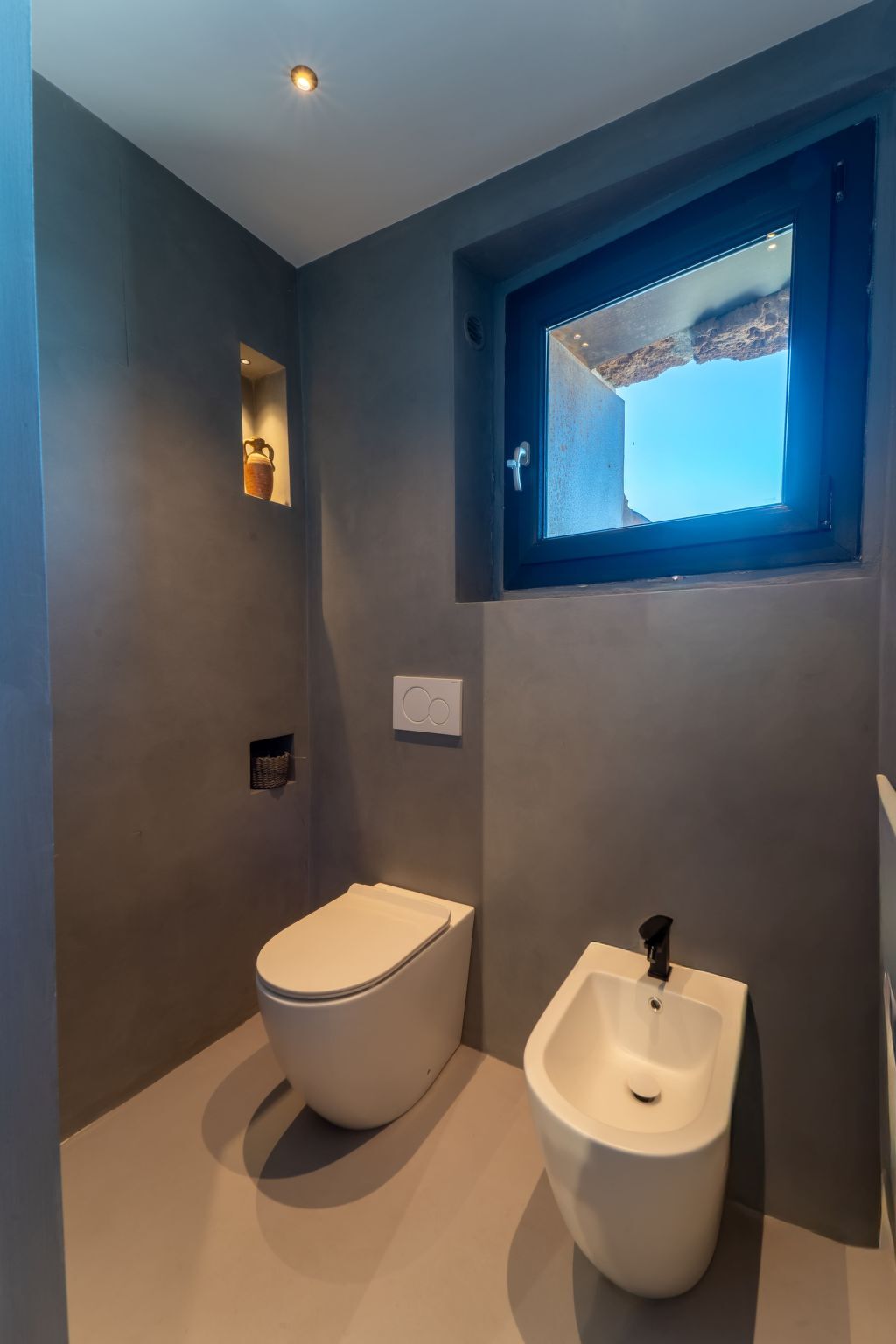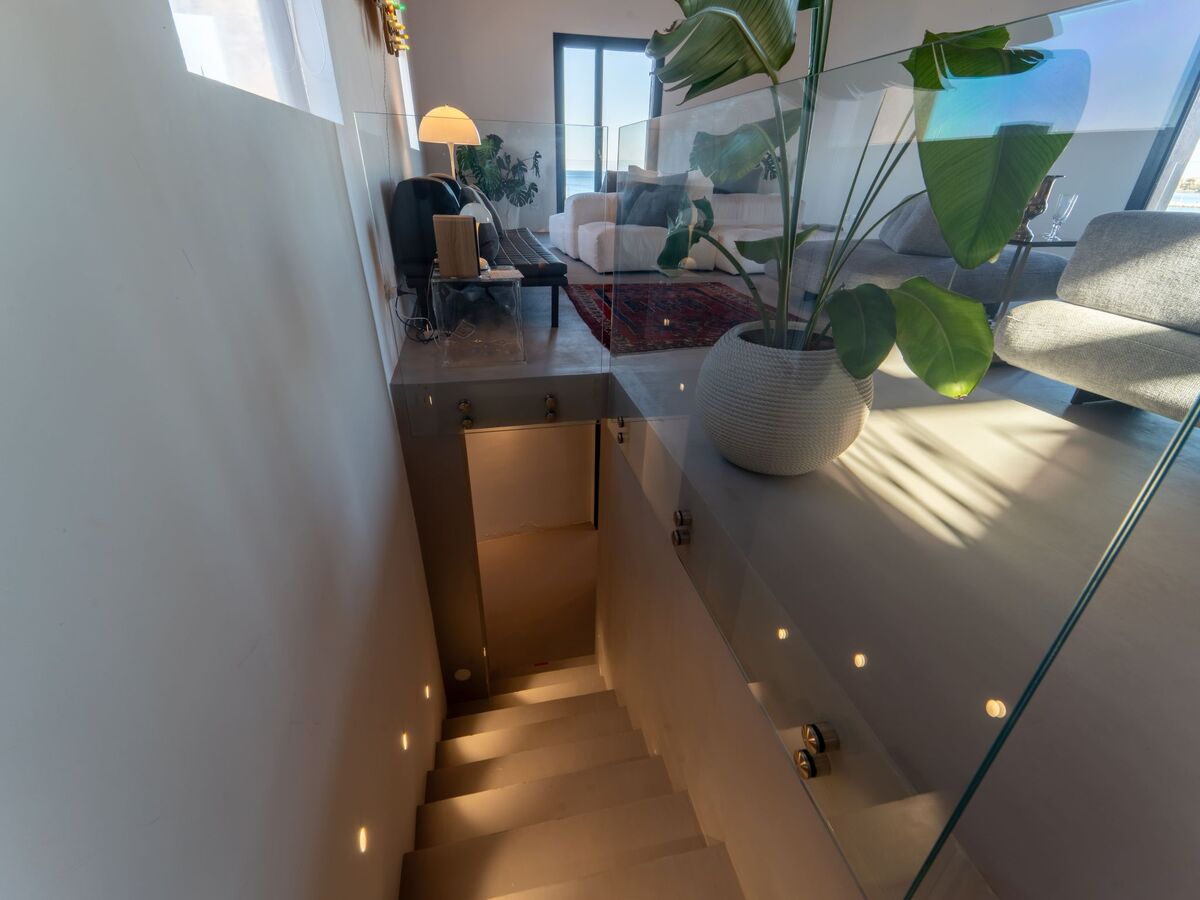 One of the rooms is set on an elegant mezzanine, accessible via a comfortable staircase, while the main suite—located on the lower level of the living area—enjoys a stunning view of the Terrasini harbor thanks to the elevated position of the house.