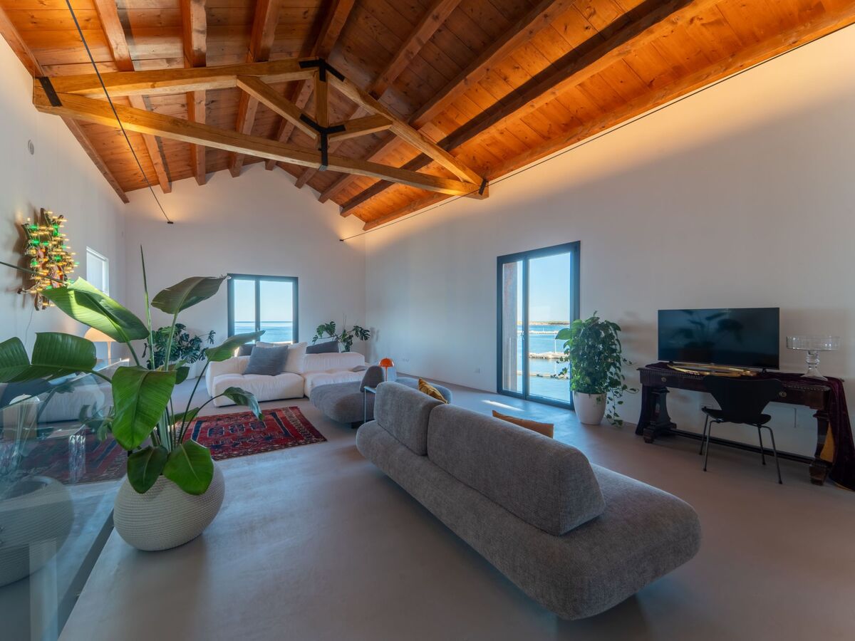 Wide glass walls overlooking the water offer breathtaking views and unforgettable sunsets, flooding the elegant open space with natural light.