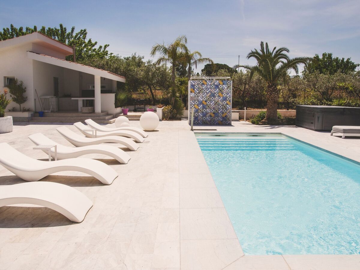 Terrace, porch, garden with barbecue, sofas, outdoor shower and toilet, dining table, chairs, large swimming pool with deckchairs and parasols.