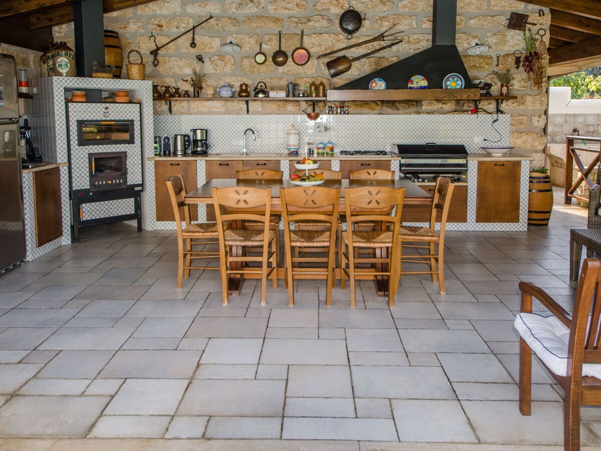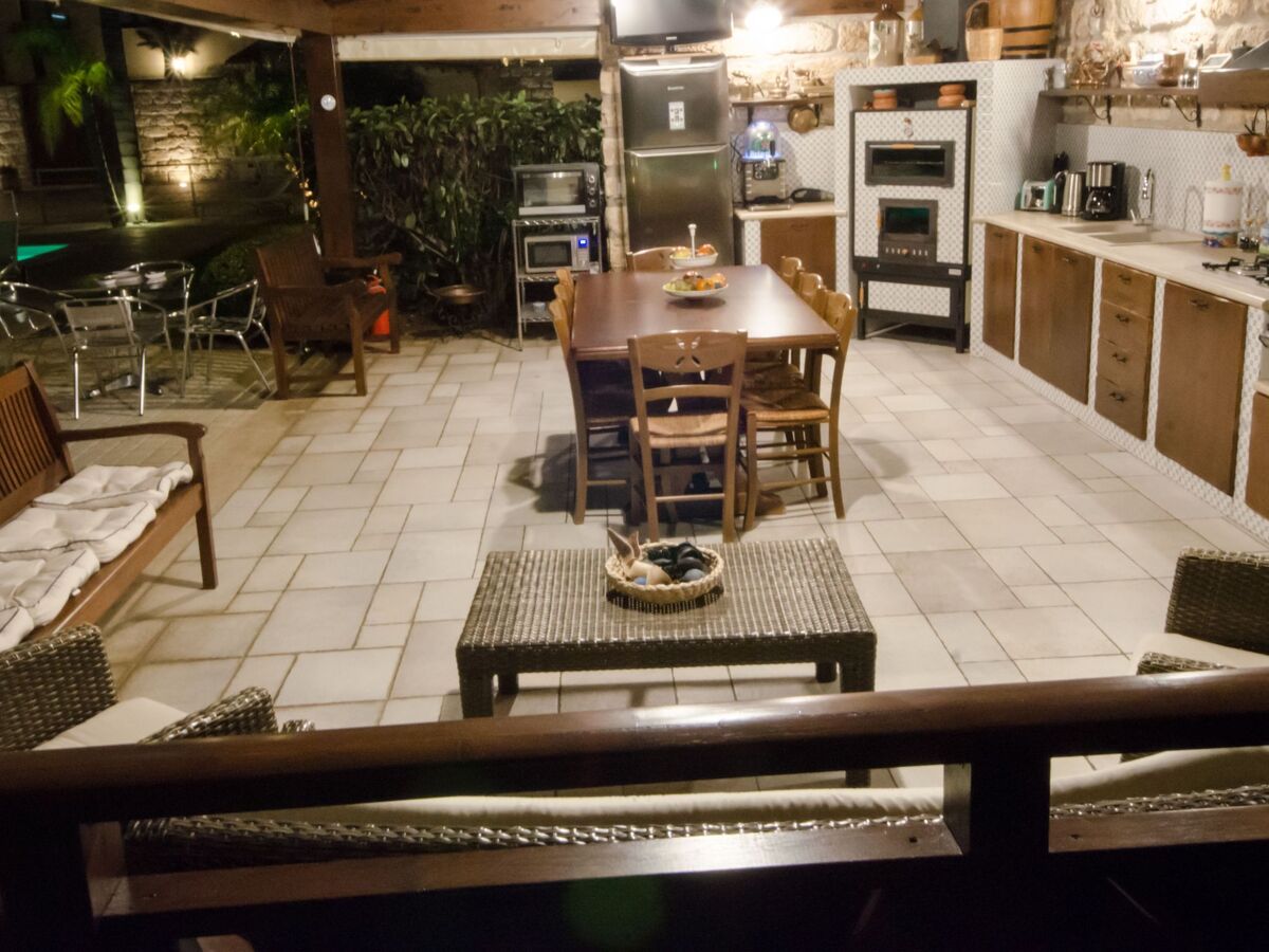 2 cuisines (intérieure et extérieure avec barbecue), équipées d'un lave-vaisselle et de nombreux autres appareils, d'une télévision, de tables pour 8 personnes extensibles jusqu'à 14 personnes.