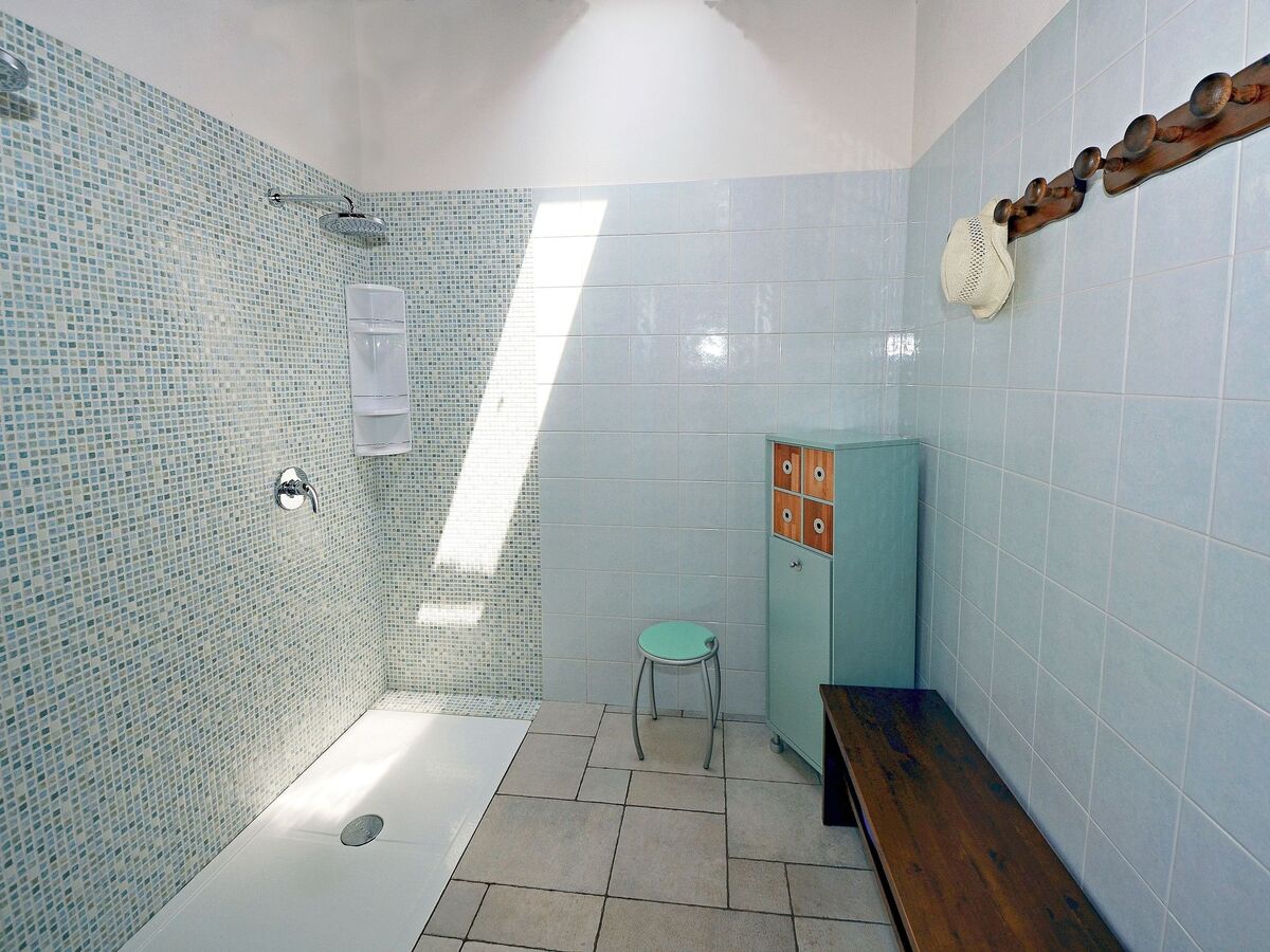 1 Douche au bord de la piscine entourée de haies vertes, en plus des 5 salles de bains ;