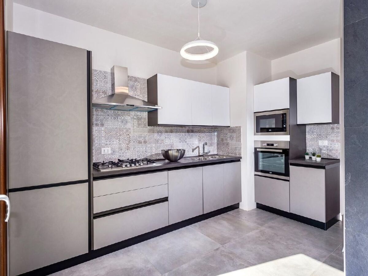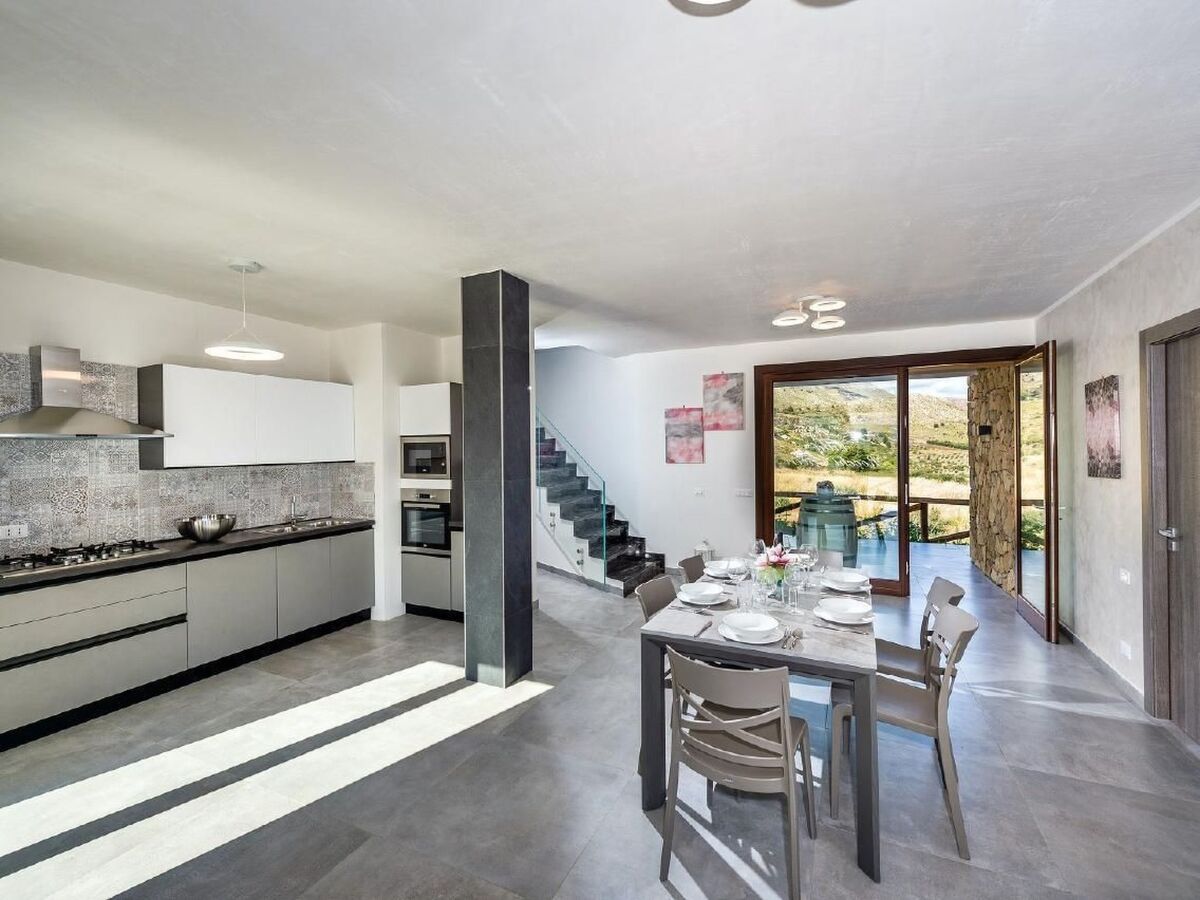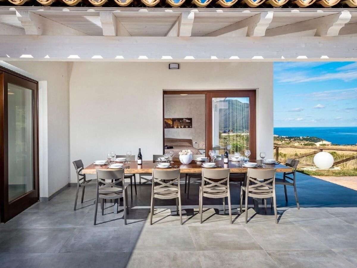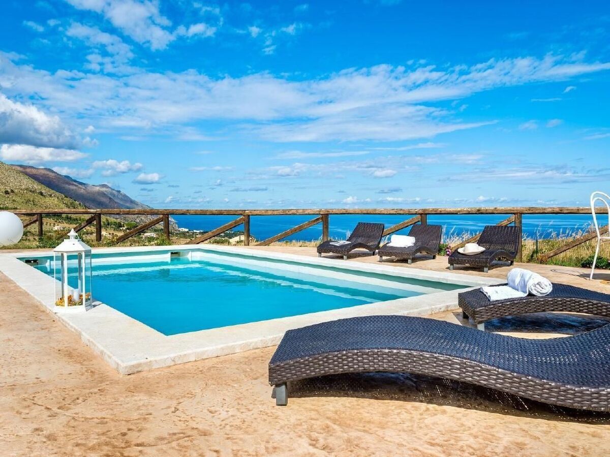 The property has an independent access, a very big natural garden scattered with milky-white rocks, where the guest can enjoy the gorgeous private pool and beautiful panoramas.The stunning panoramic view over the Gulf of Castellammare and the Bay of Scopello is framed by large windows embellishing the villa.