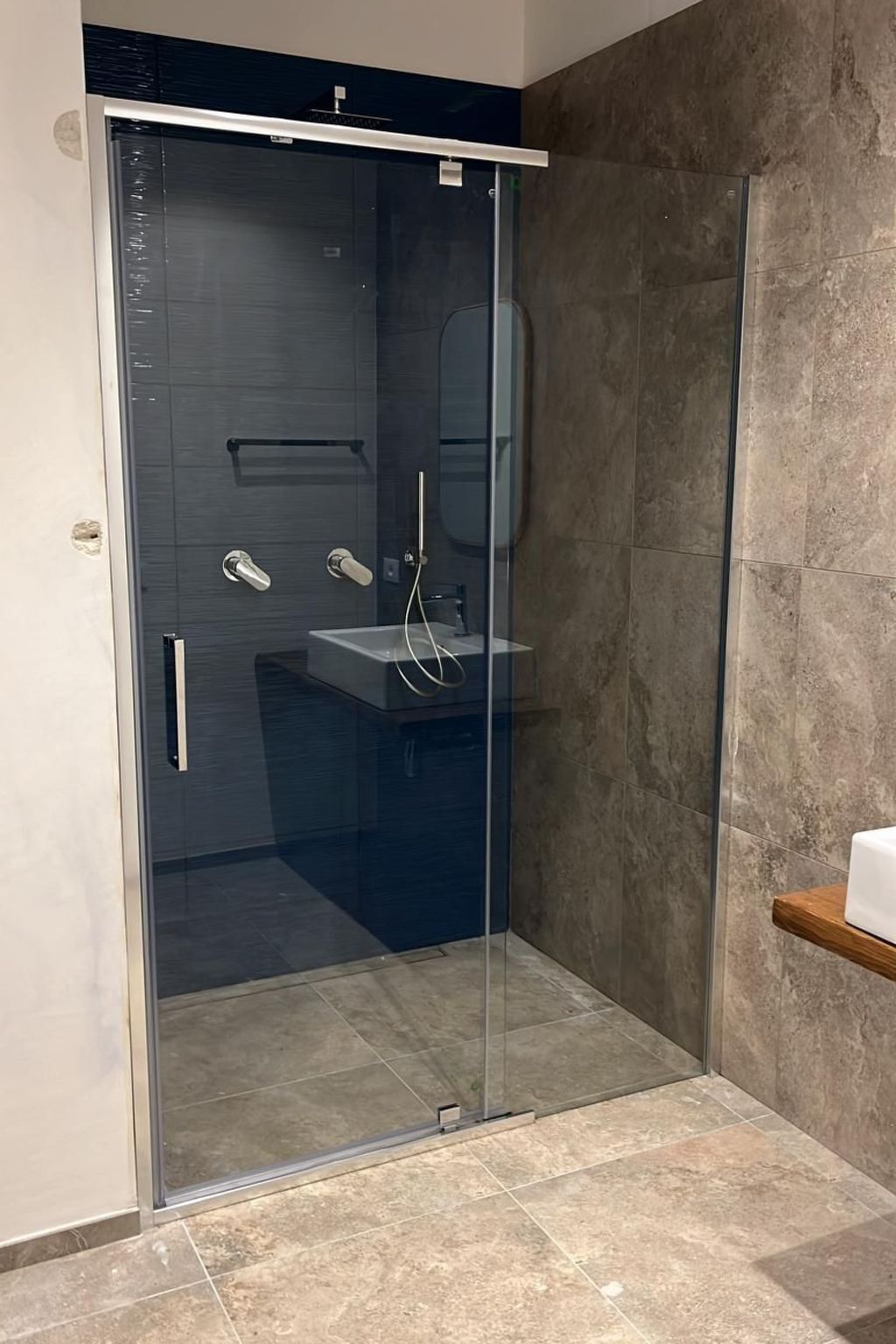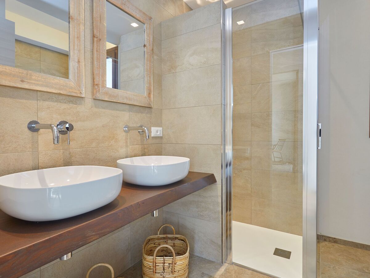On the ground floor, there is a spacious living room with a sofa and tv-sat and kitchen corner, one double bedroom, one twin bedroom and one bathroom with 2 basins and a shower.The modern kitchen is equipped with induction hob and dishwasher.