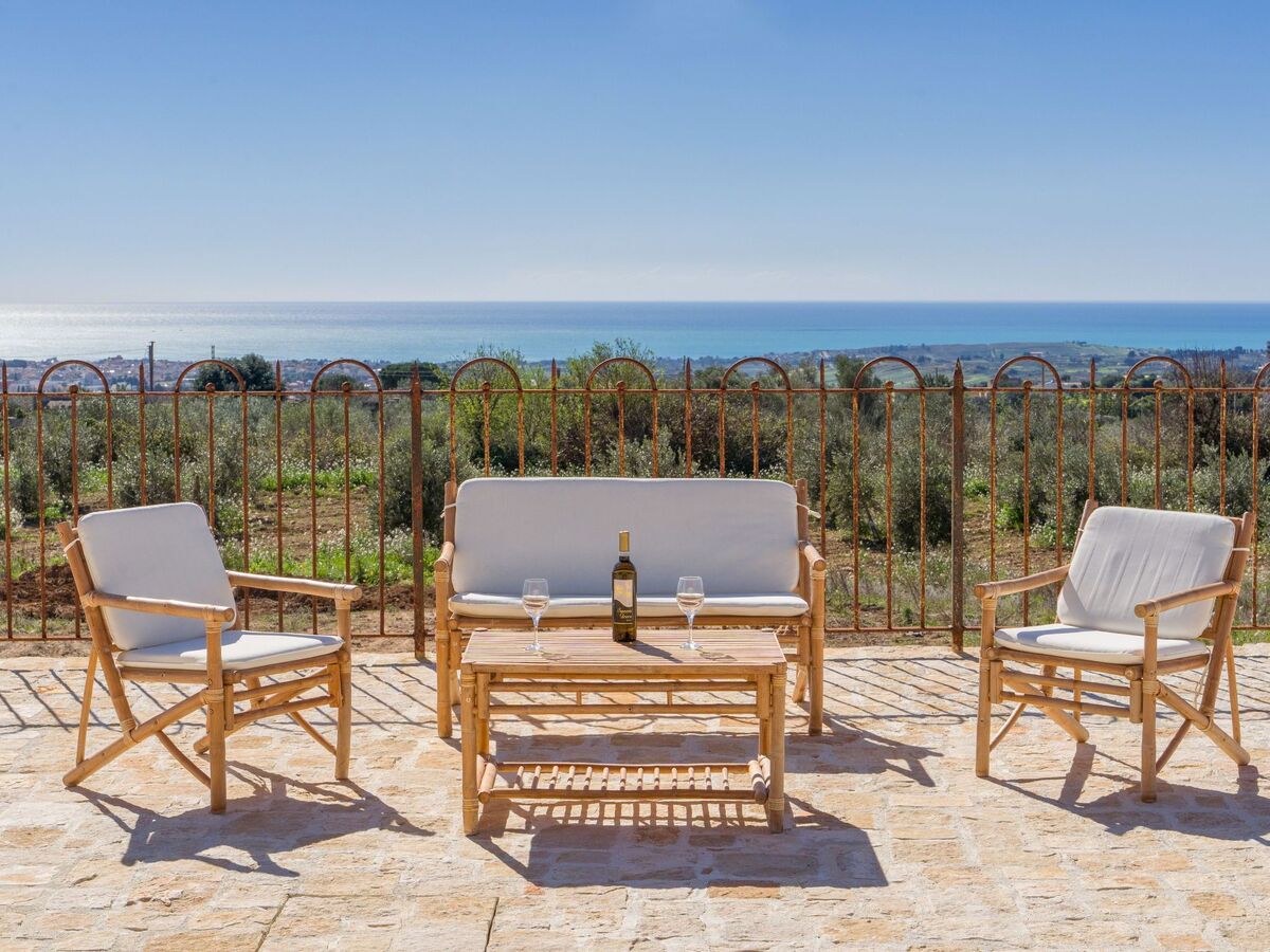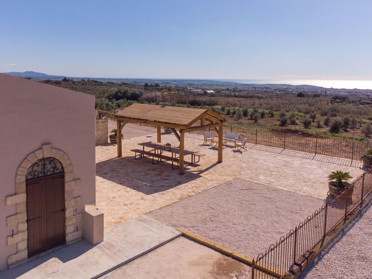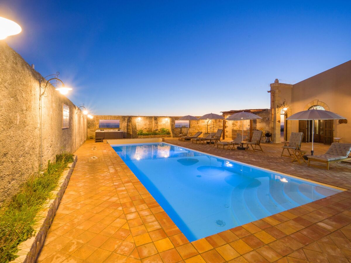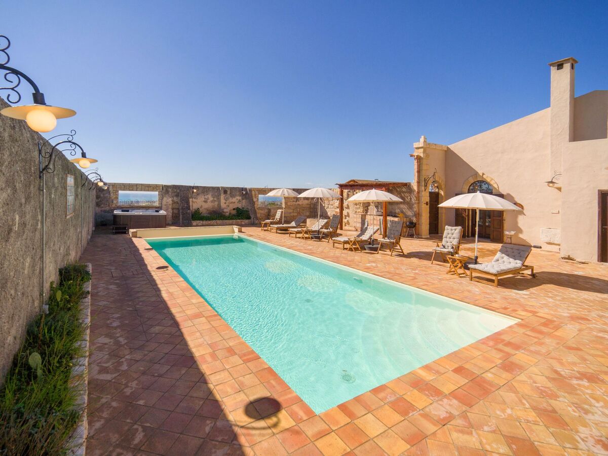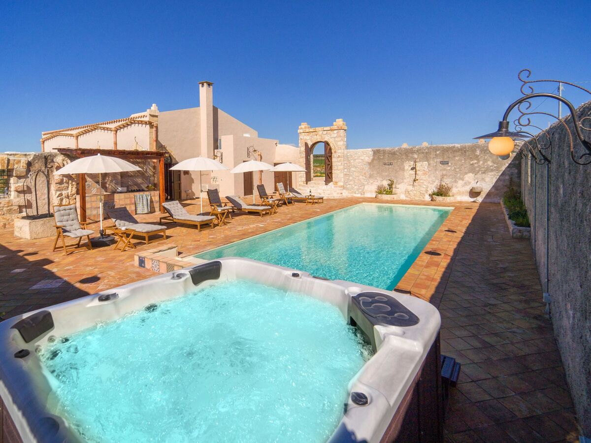 The house has an outdoor area with a heated swimming pool, a jacuzzi and a terrace overlooking the countryside and the sea of Menfi.