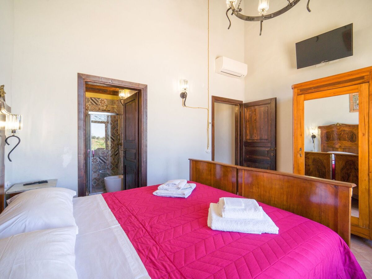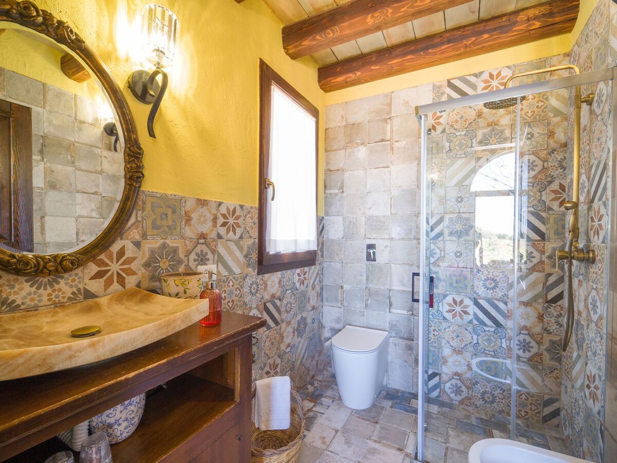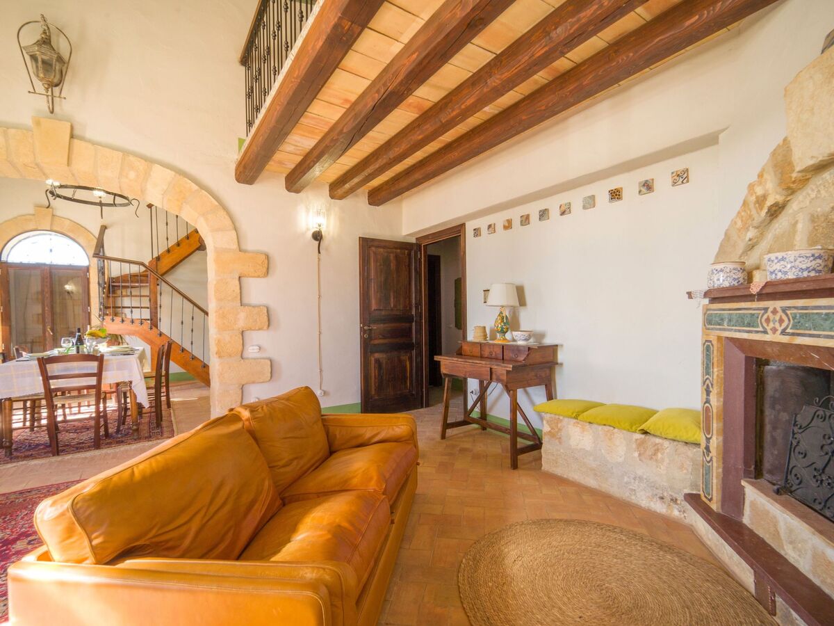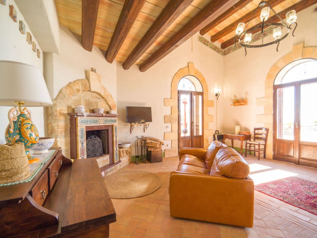Inside, the house is on two levels: on the ground floor we have two bedrooms both with en-suite, another service bathroom and a beautiful Sicilian-style kitchen and an elegant living room with fireplace.