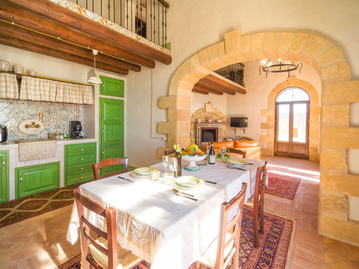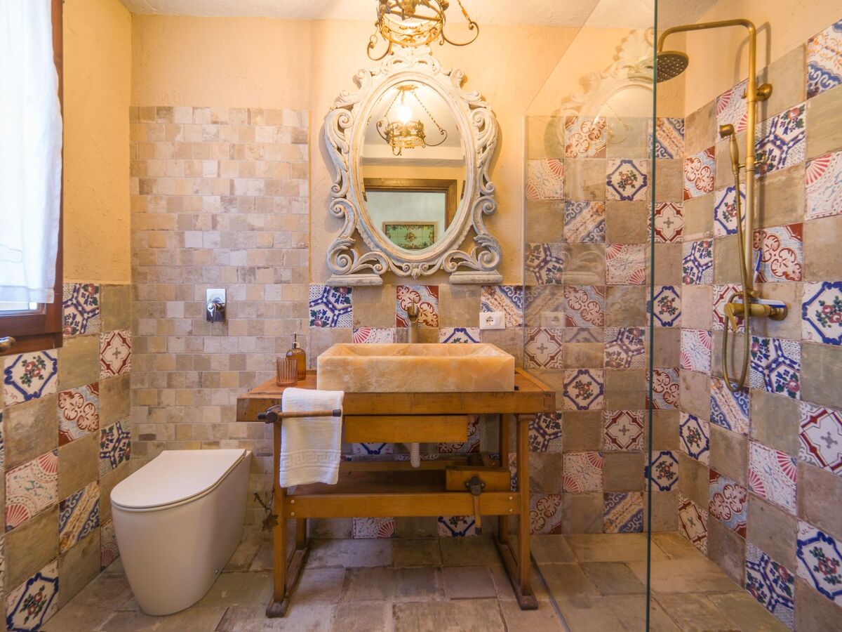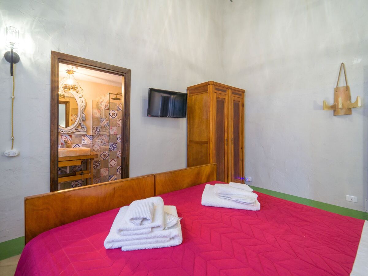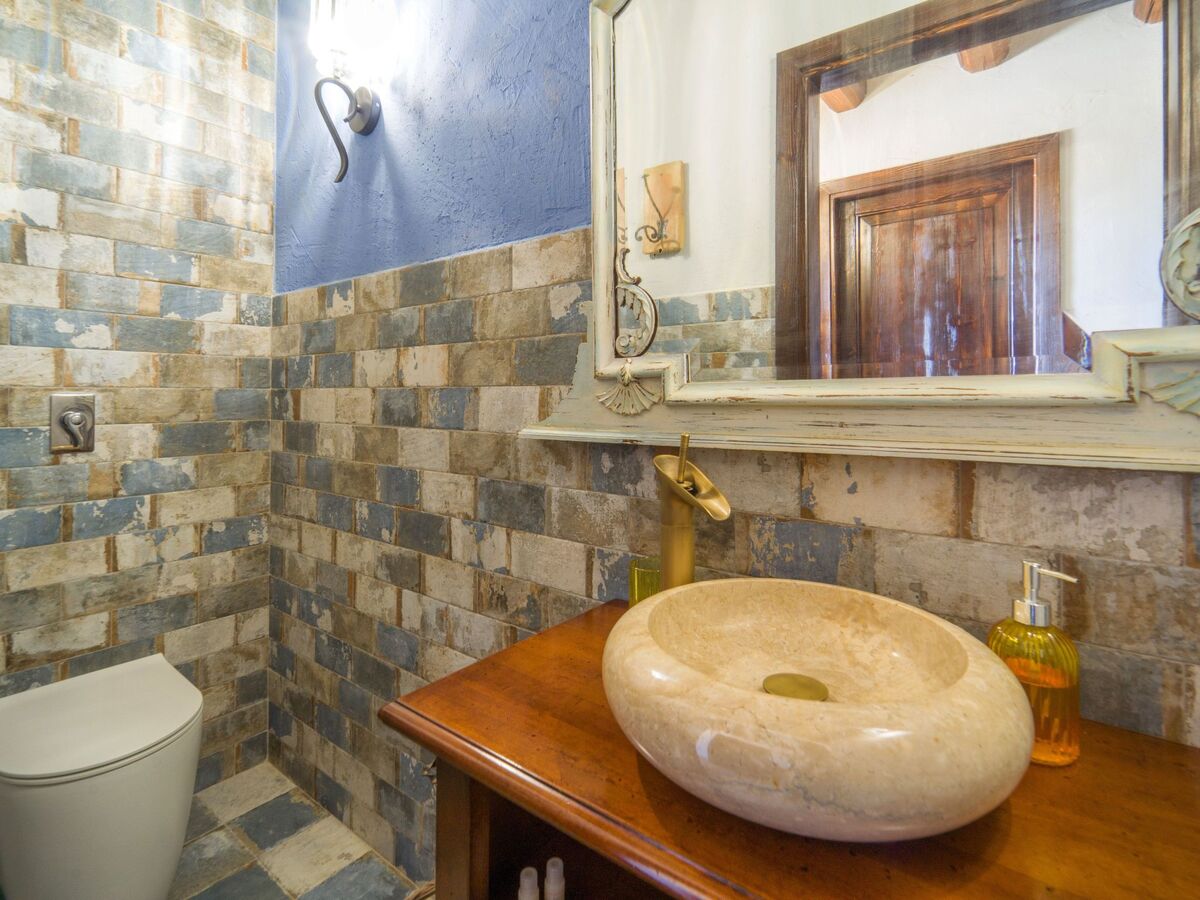 Inside, the house is on two levels: on the ground floor we have two bedrooms both with en-suite, another service bathroom and a beautiful Sicilian-style kitchen and an elegant living room with fireplace.