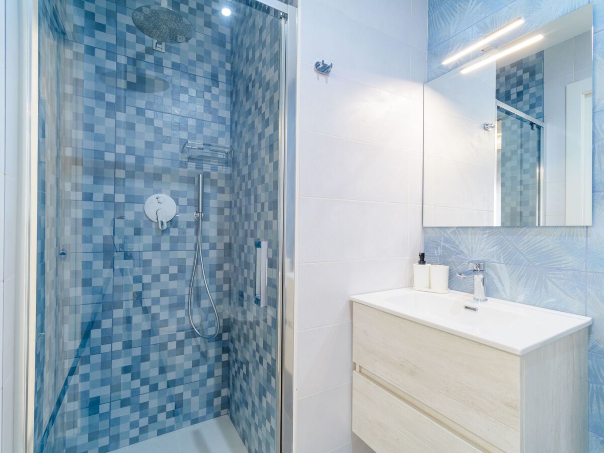 Il y a une douche extérieure et une zone de détente, en face de la piscine, meublée de chaises longues.