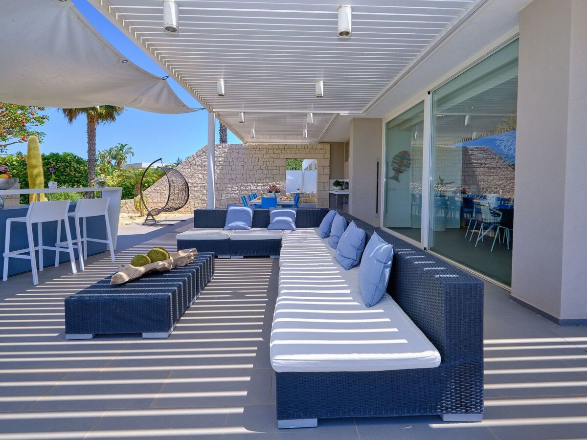 Une élégante terrasse meublée avec salon extérieur, table à manger et cuisine extérieure avec barbecue.