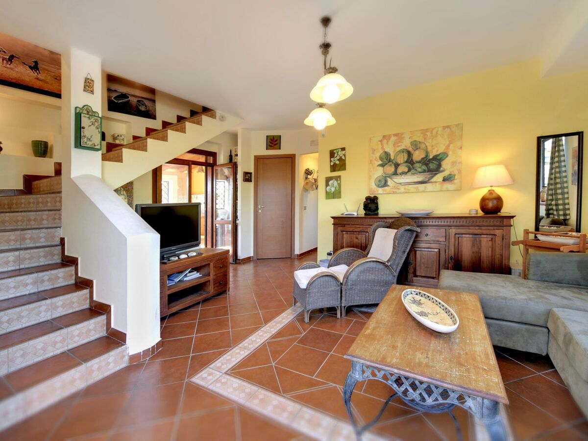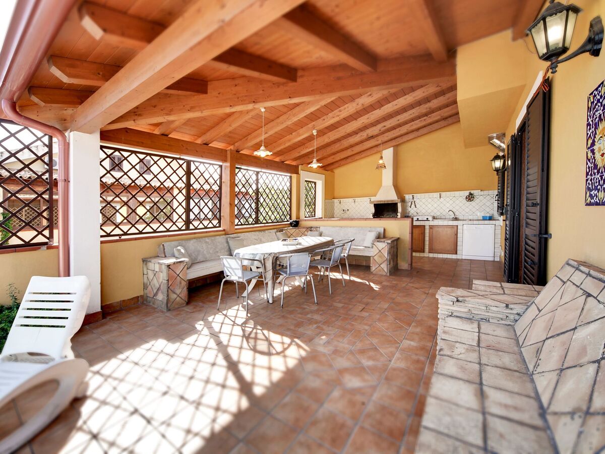 La maison est répartie sur trois niveaux, le plus bas avec une véranda attenante, comprenant une grande salle à manger avec une cheminée en briques et une grande table en bois, équipée d'un canapé-lit double ; de cette salle, on accède à une cuisine entièrement équipée avec four et cuisinière électriques et réfrigérateur avec congélateur.