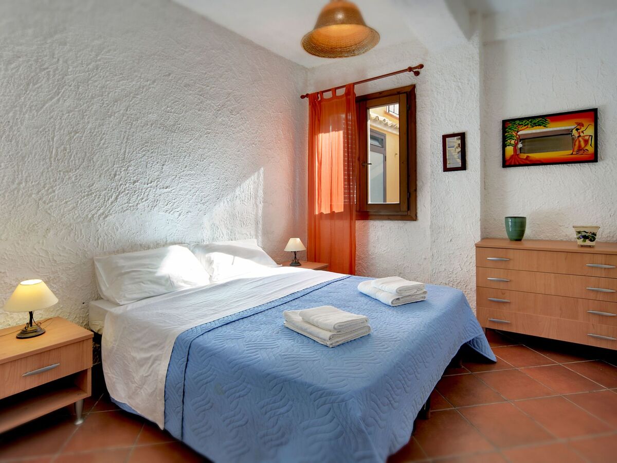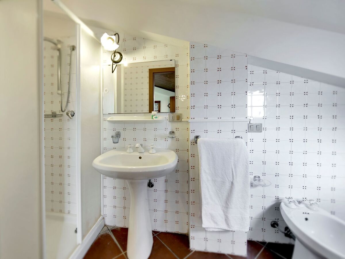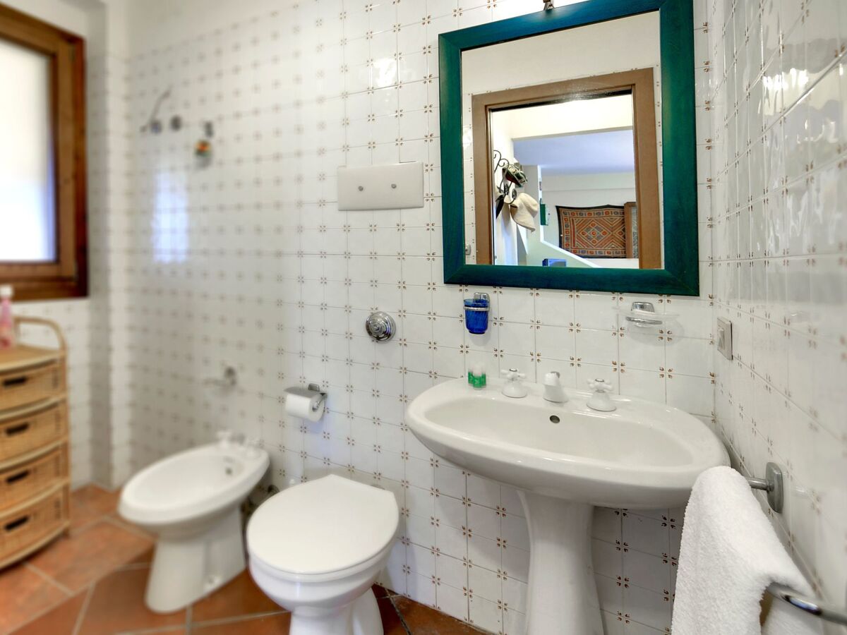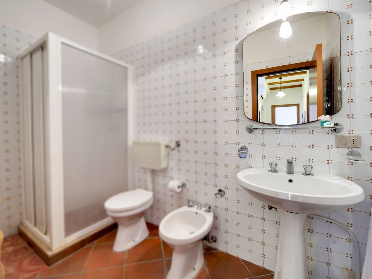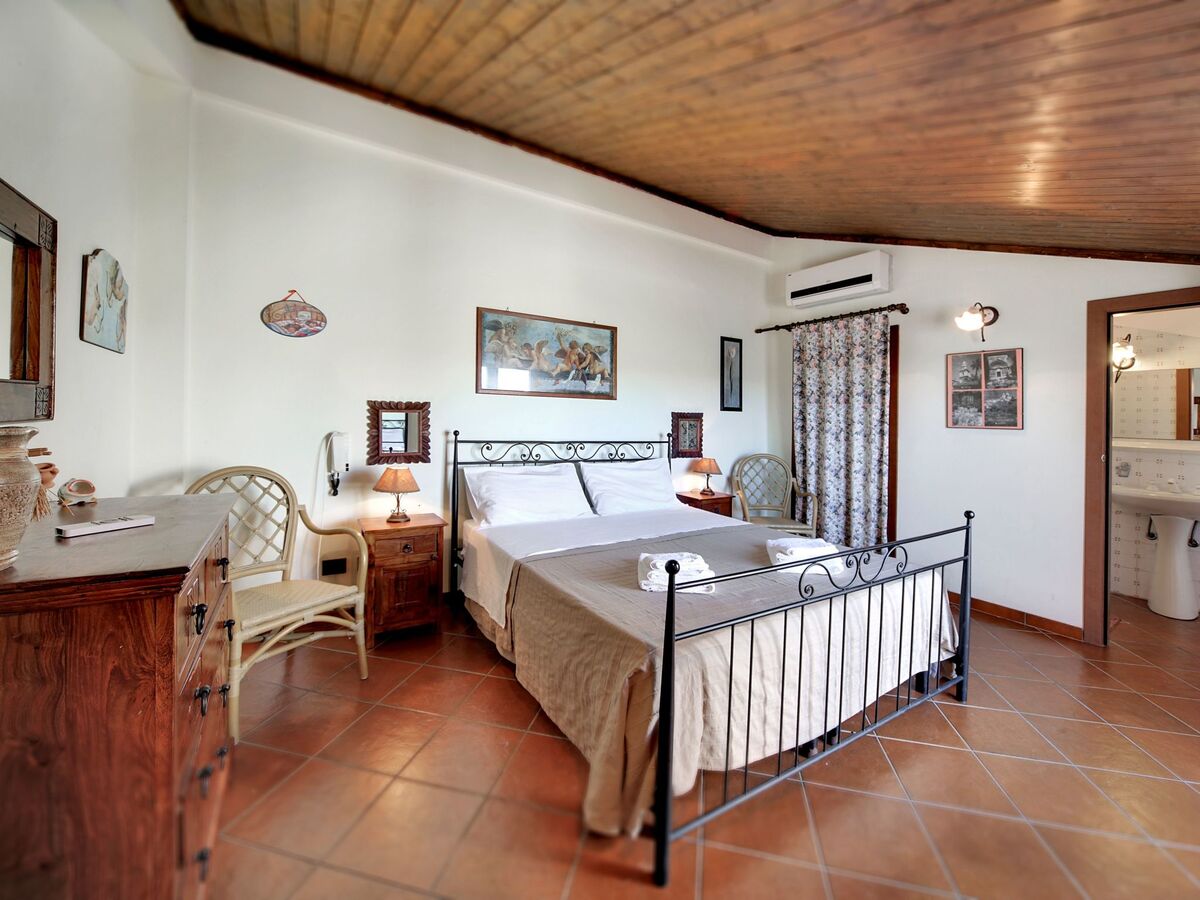 Le premier étage, quant à lui, comprend une chambre double avec une commode et deux tables de chevet, une salle de bains attenante avec douche et une petite véranda privée donnant sur la piscine.