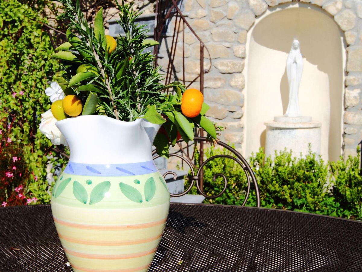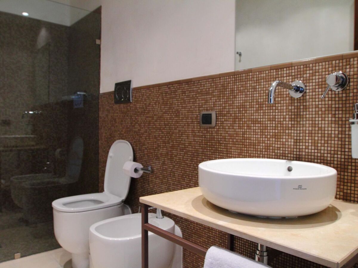 At the back of the house, surrounded by a well-kept garden with typical Mediterranean plants, you will find a lovely swimming pool decorated with mosaics and a lava stone paved area with sun loungers and an outdoor shower.