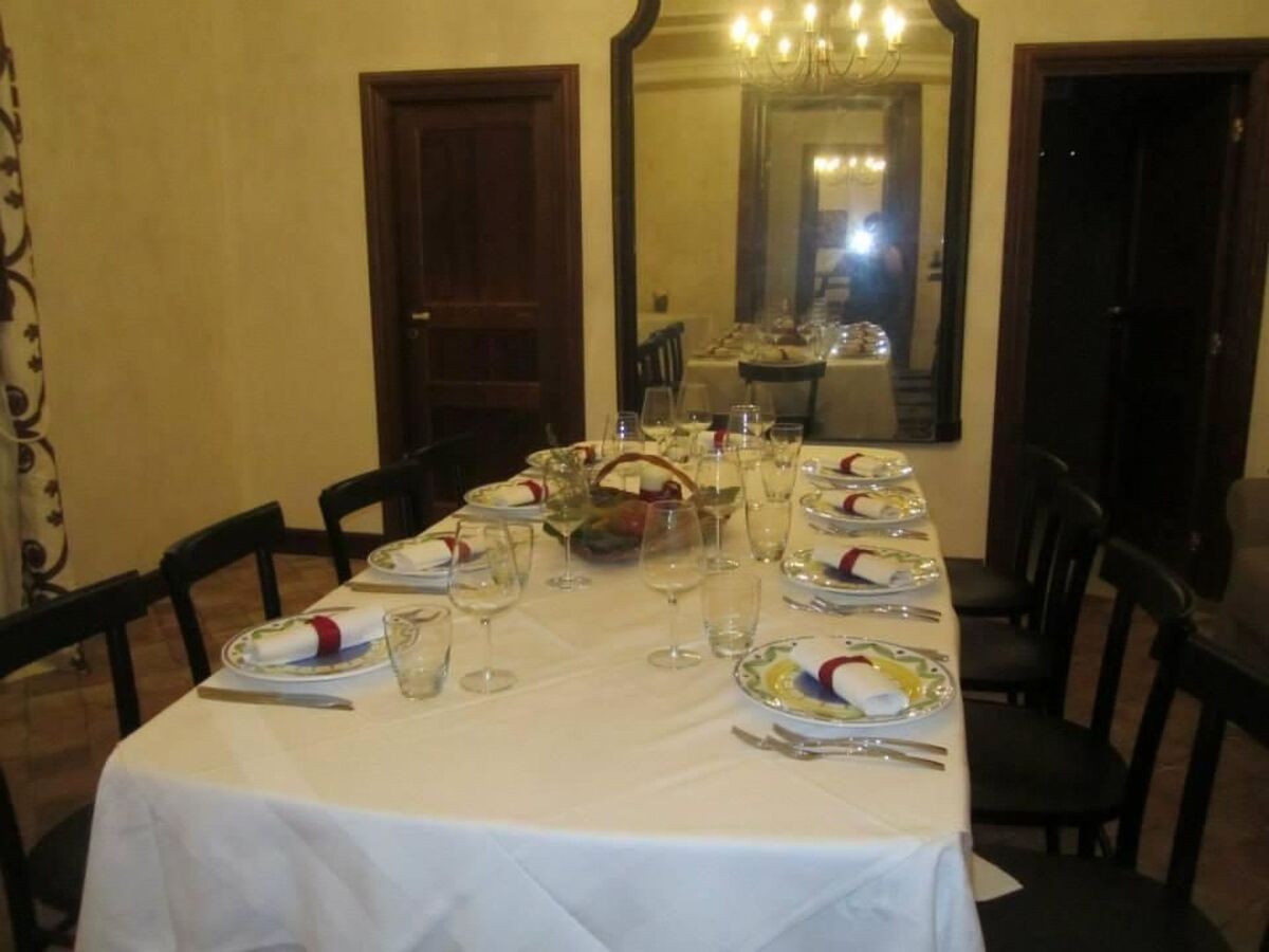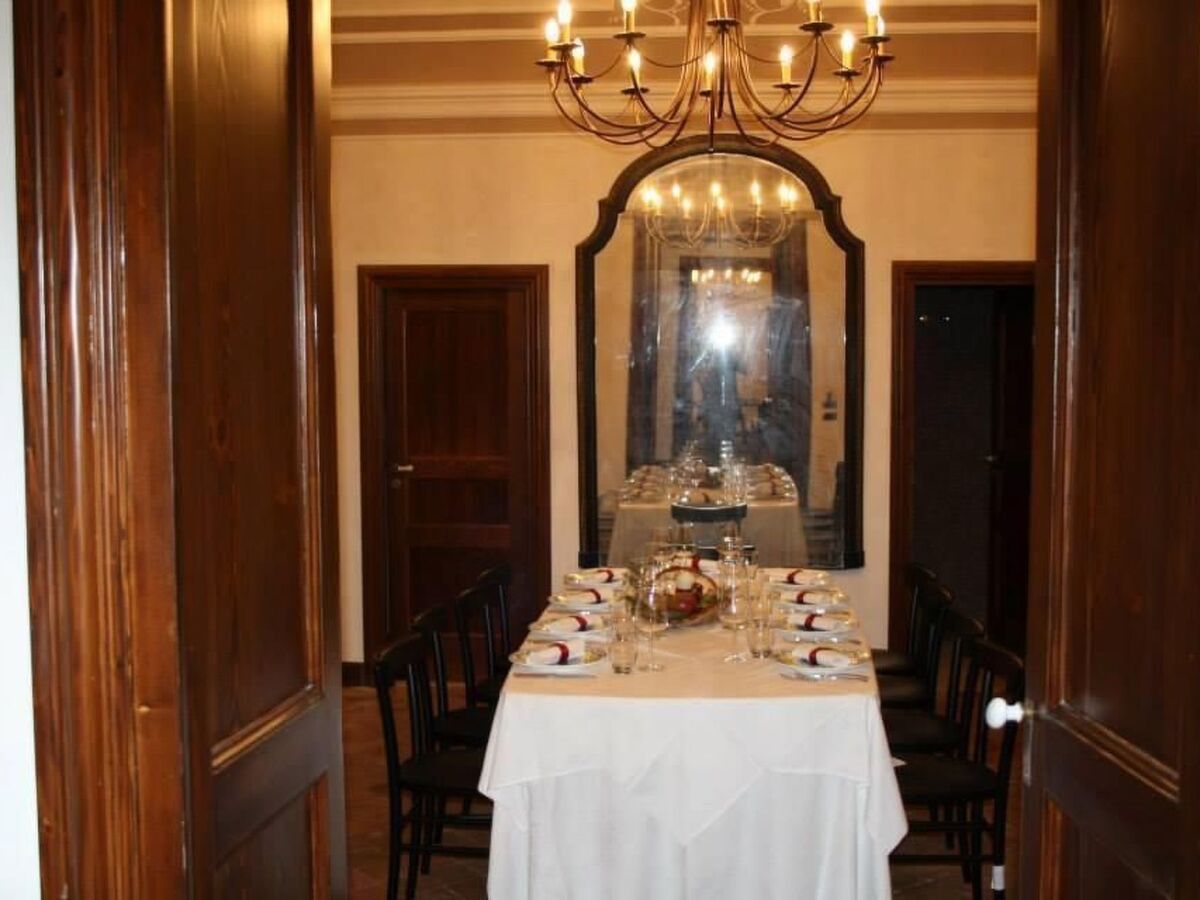 The elegant dining room, located next to the kitchen, awaits you with beautifully decorated ceilings and antique furniture.