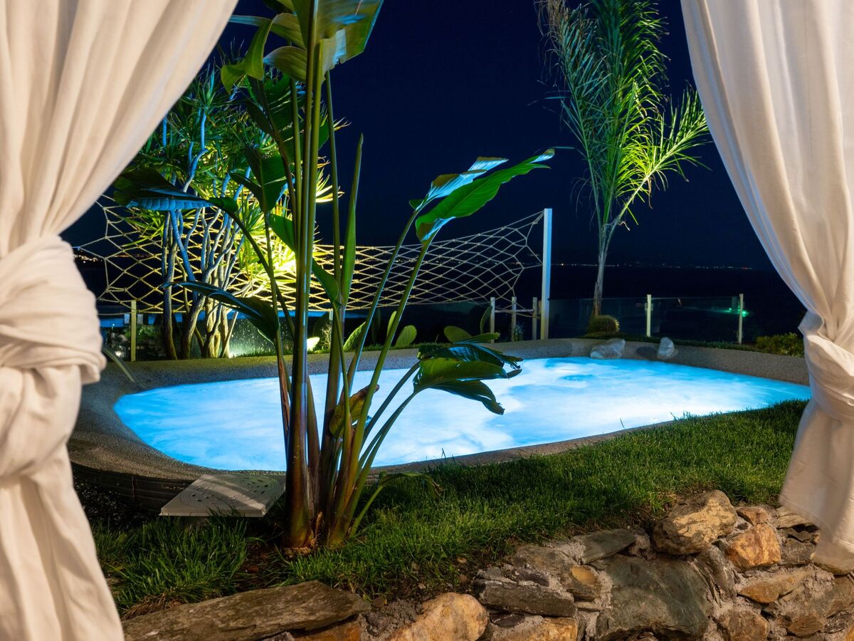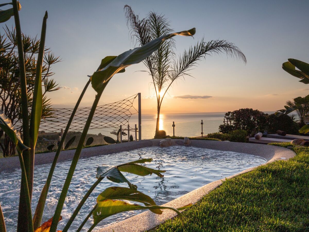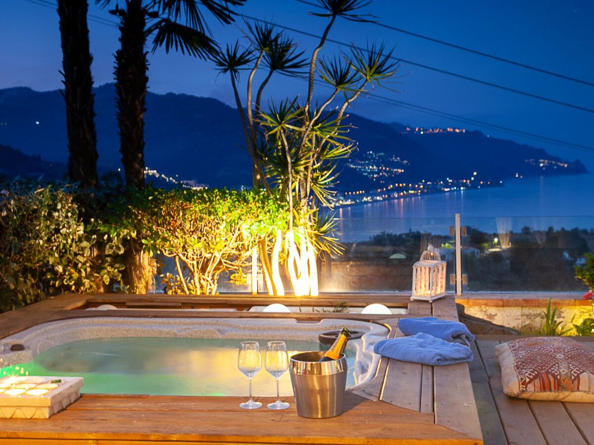 The villa's exterior features a beautiful patio with terraced garden, a splendid 6-seater heated Jacuzzi with aromatherapy, chromotherapy and oxygen therapy, and a sea view.