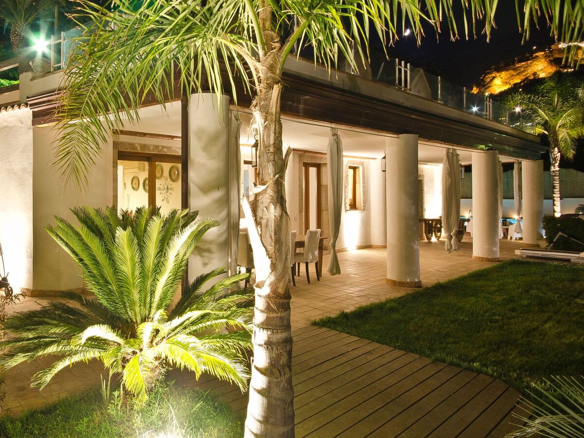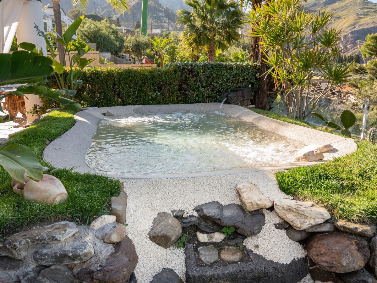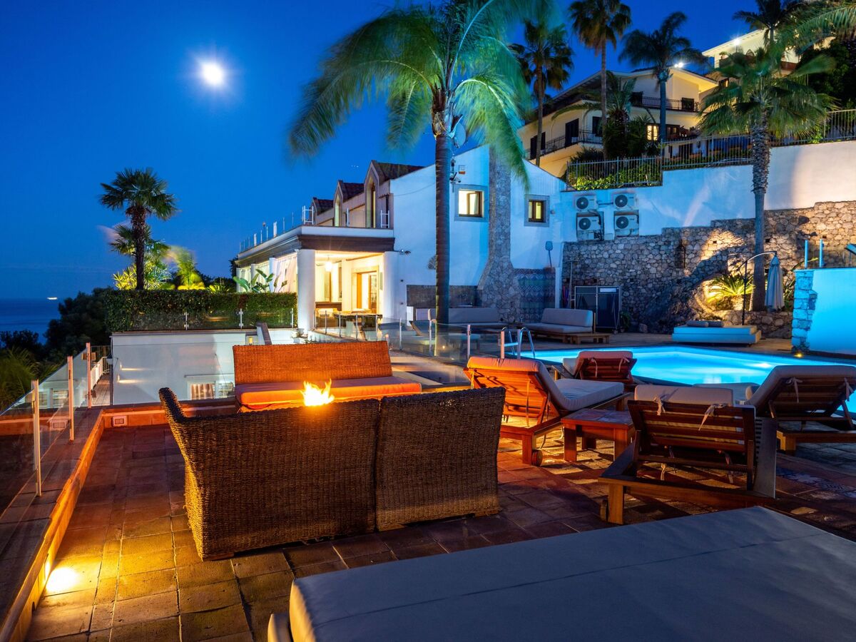 The villa's exterior features a beautiful patio with terraced garden, a splendid 6-seater heated Jacuzzi with aromatherapy, chromotherapy and oxygen therapy, and a sea view.