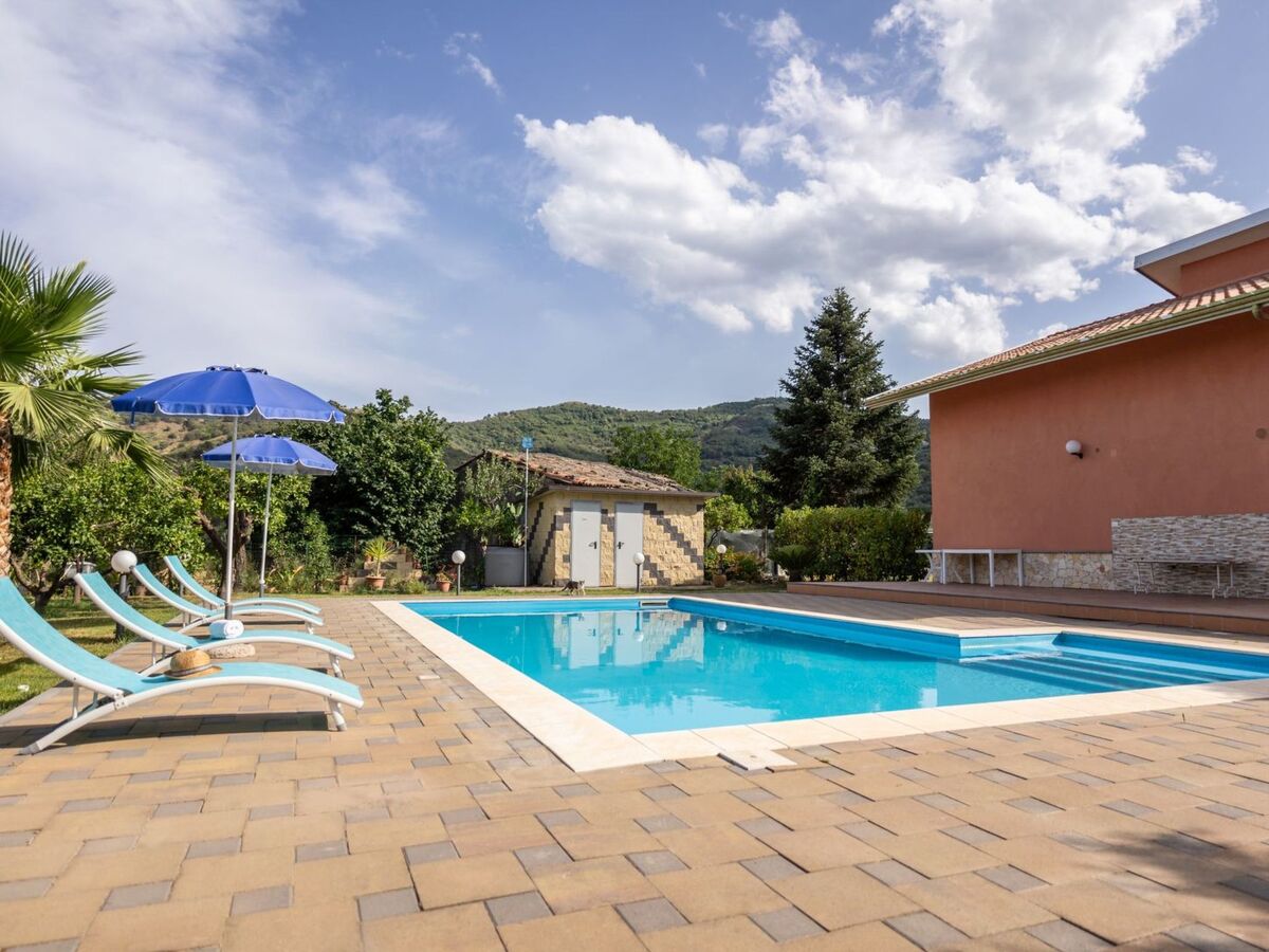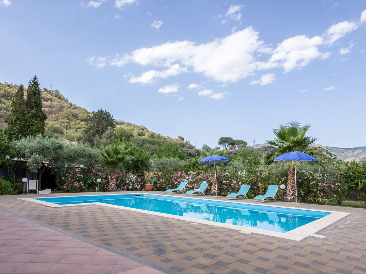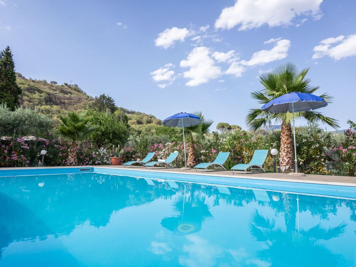 The private swimming pool, surrounded by a large sunbathing area, invites guests to take a dip and relax under the Sicilian sun.
