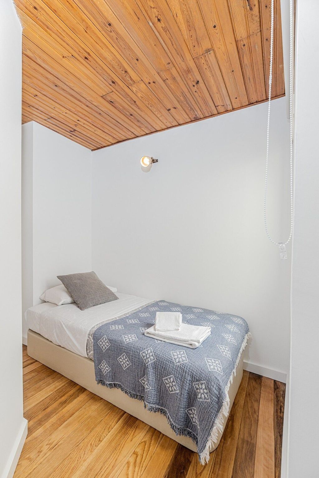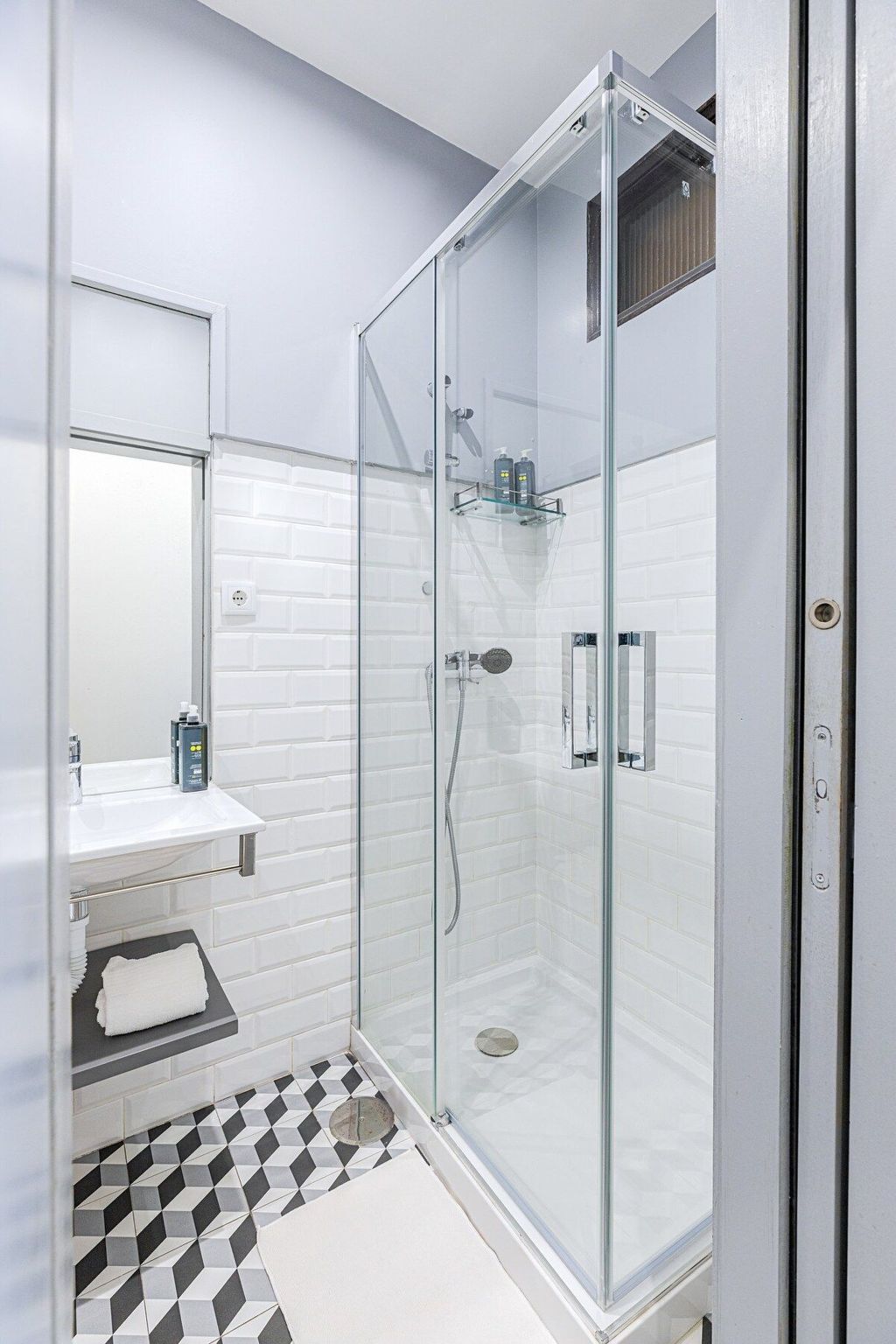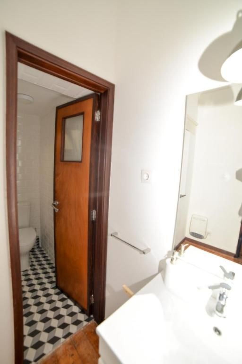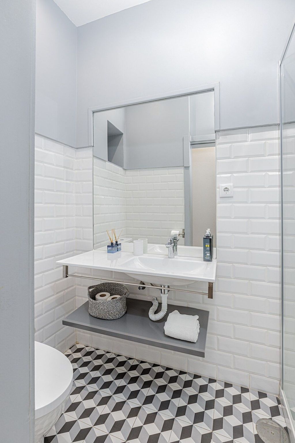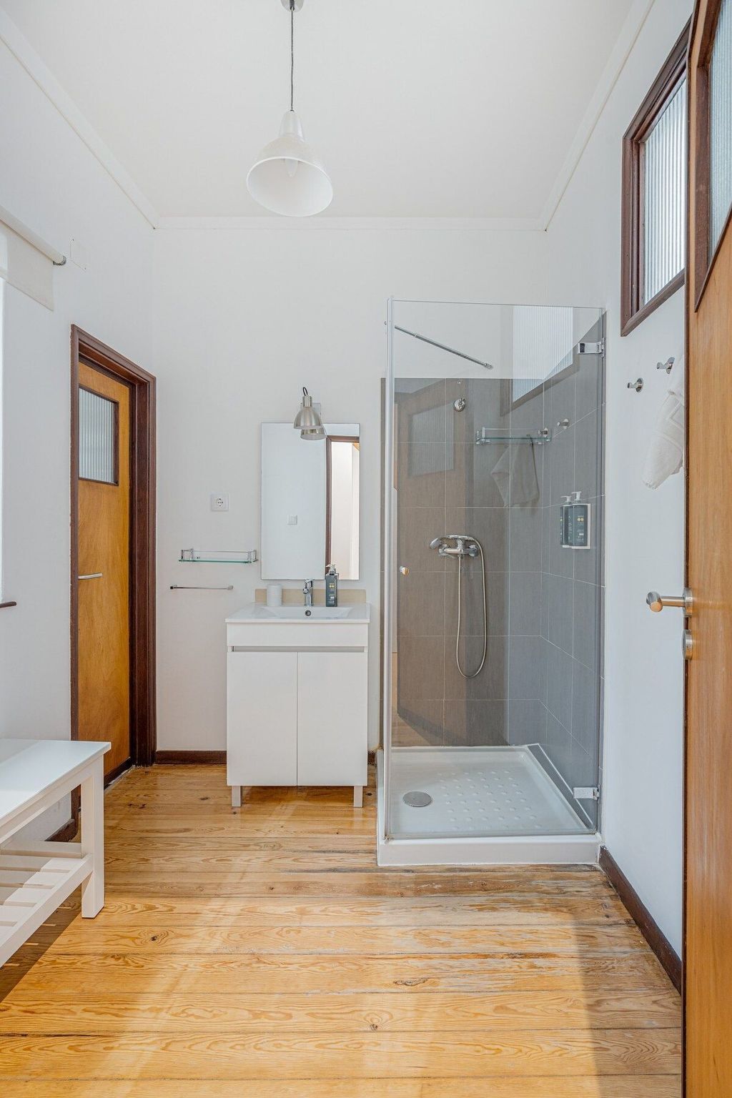 The bathroom, maintaining its original design and old wooden flooring, was entirely rehabilitated, featuring a new shower cabin, as well as modern bathroom fixtures.