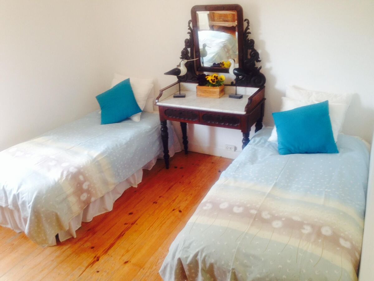 Both twin rooms offer garden views, with one featuring access to a quaint balcony overlooking the swimming pool.