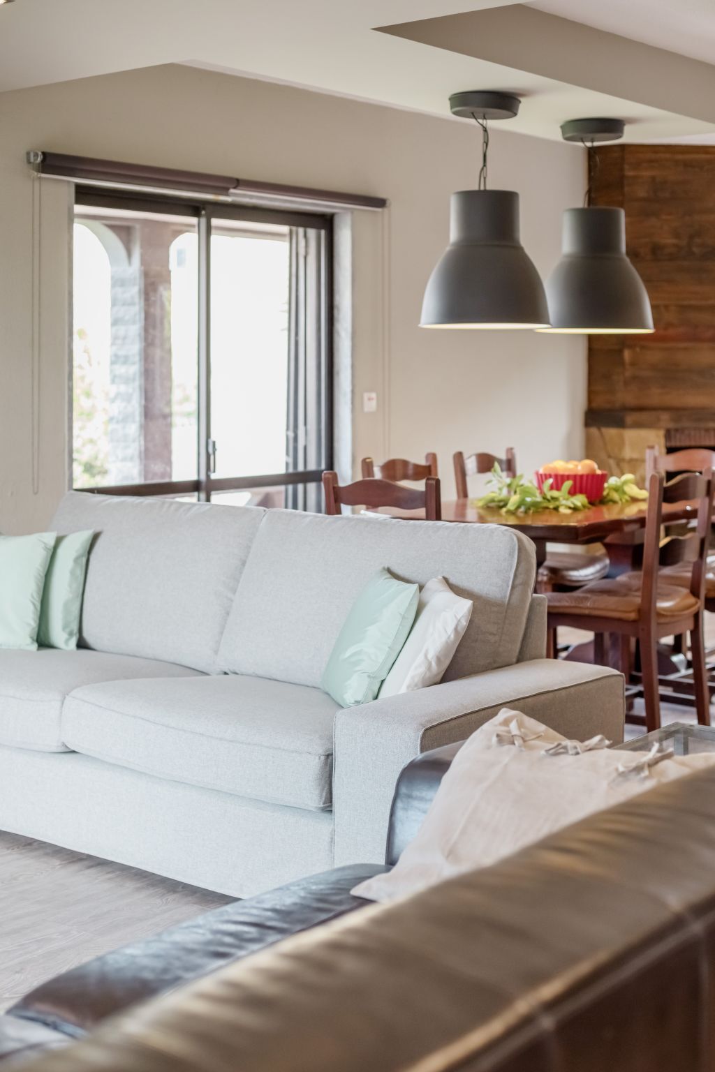 A sofa area with 2 sofas and the flat screen TV, the dining area and the open-plan kitchen area.